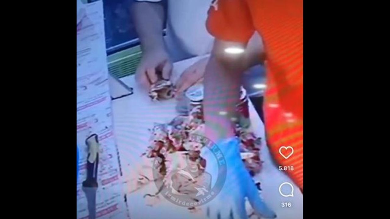 Konak Eşrefpaşa Caddesi'ndeki bir büfede 3 tane şöğüş sipariş eden bir müşteri tezgahta bulunan kuzu dilini de cebine attı. Hırsızlık olayı dükkanın kameralarına yansıdı.