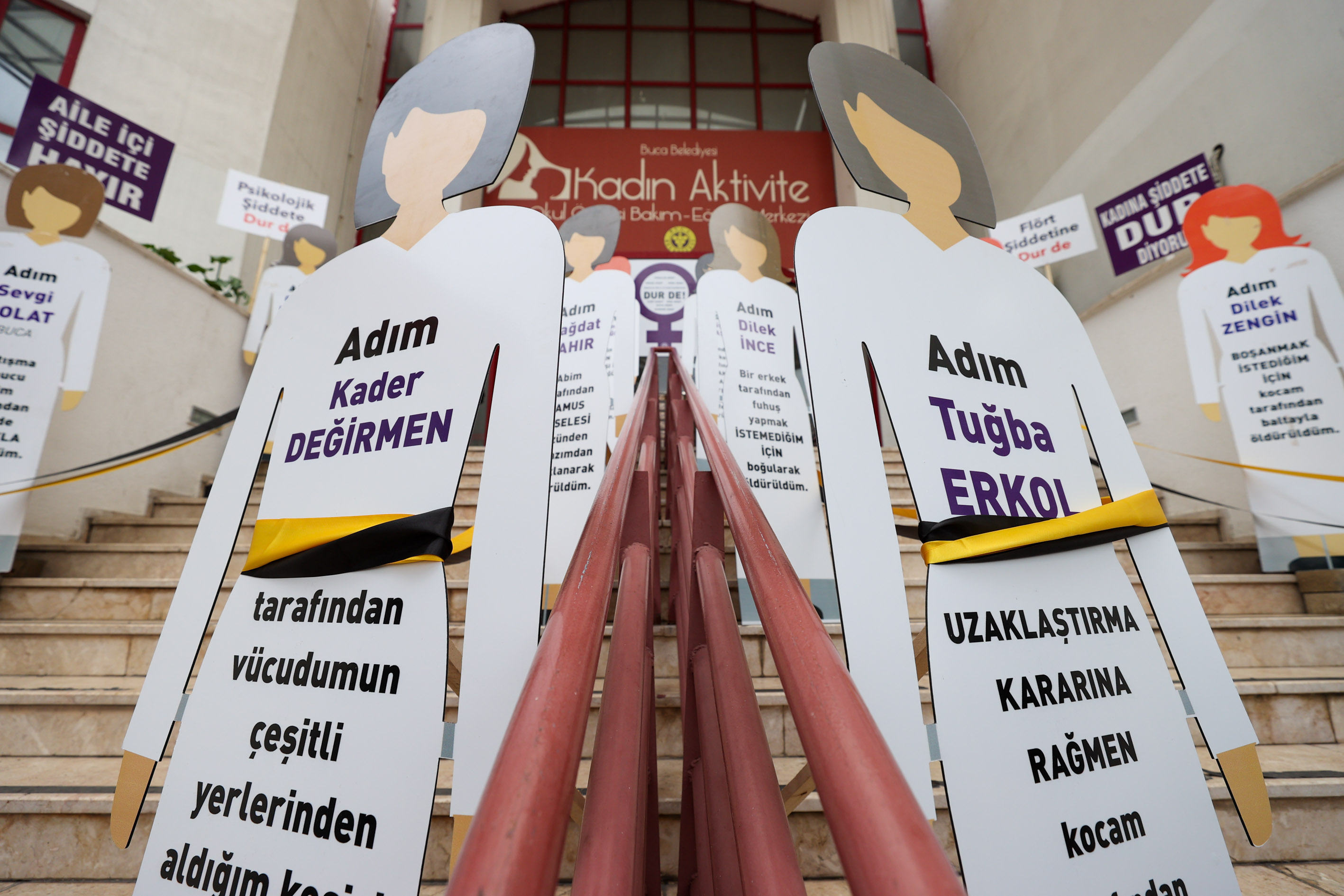 Kadın Aktivite Merkezi önünde hazırlanan cinayete kurban giden 15 kadının isimleri ve hikayelerinin yer aldığı kadın maketleri sergisi ise büyük dikkat çekti.