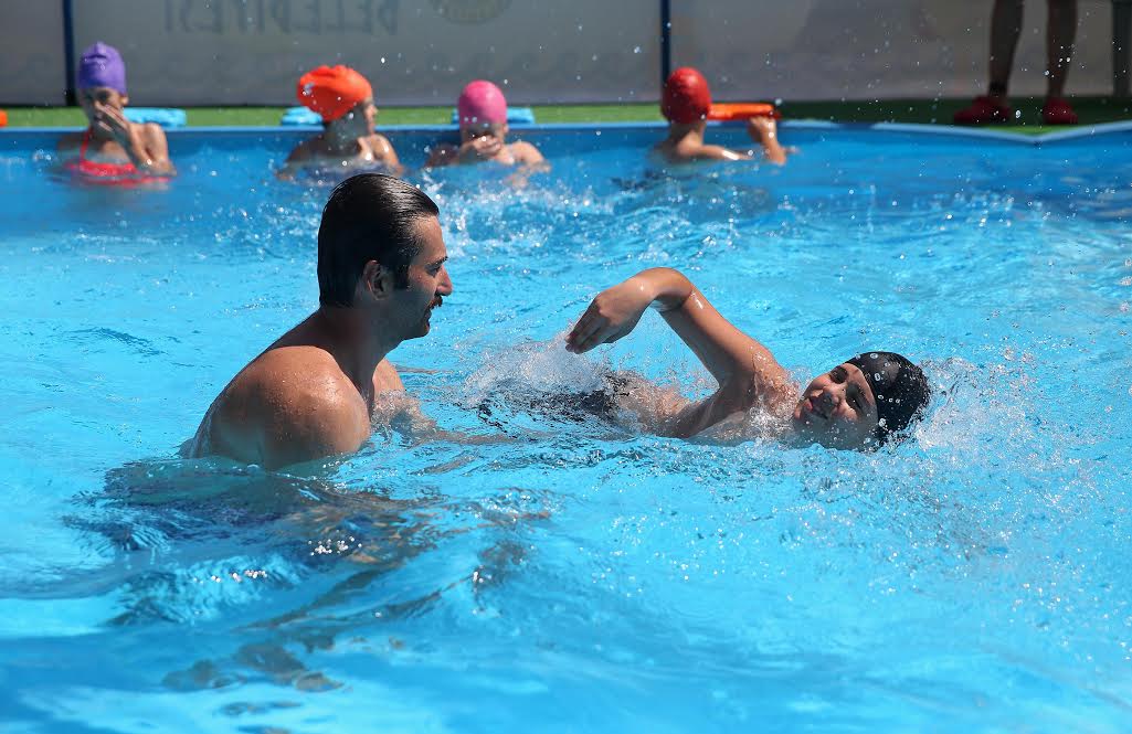 Portatif havuzlarda ücretsiz olarak verilen temel yüzme eğitimlerine katılan çocuklar yüzme öğrenmenin keyfini yaşıyor. Deneyimli eğitmenler eşliğinde haftanın altı günü verilen eğitimlerde 7-14 yaş arası her bir çocuk haftada 3 gün, günde 1'er saat temel yüzme eğitimi alıyor.