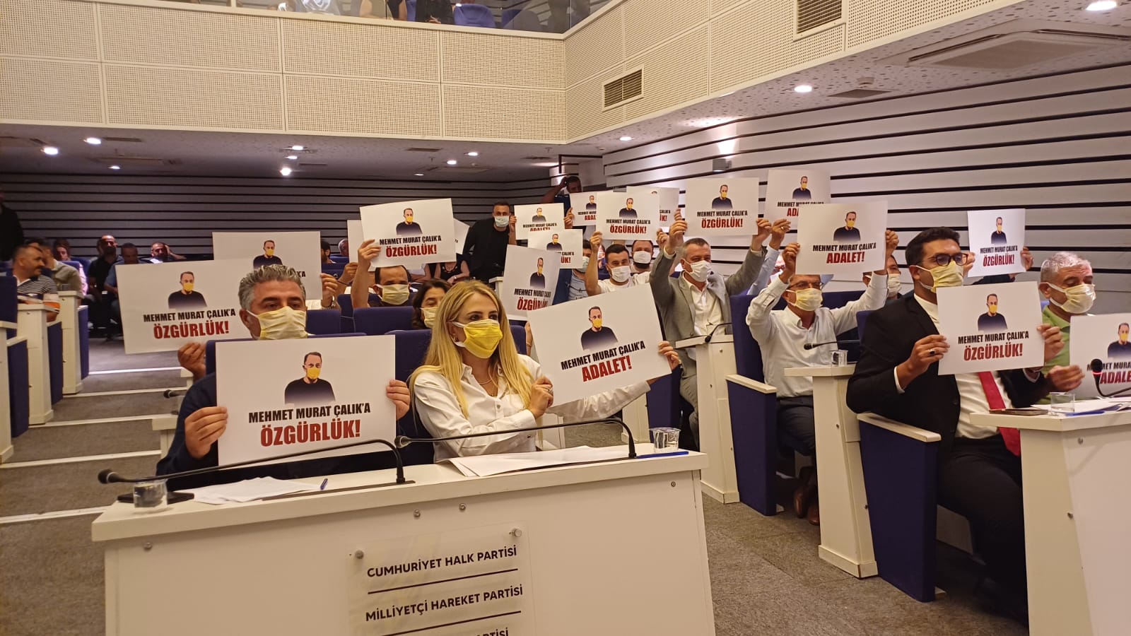 Dilek ve temenniler bölümünde ise CHP Grubu’ndan dikkat çeken bir protesto gerçekleşti. Sağlık sorunları nedeniyle tetkikleri yapılan tutuklu Beylikdüzü Belediye Başkanı Mehmet Murat Çalık’ın yeniden Buca Cezaevi’ne sevk edilmesinden sonra CHP’li meclis üyeleri maske takarak ve “Mehmet Murat Çalık’a Adalet” yazılı pankartı açarak protesto etti.
