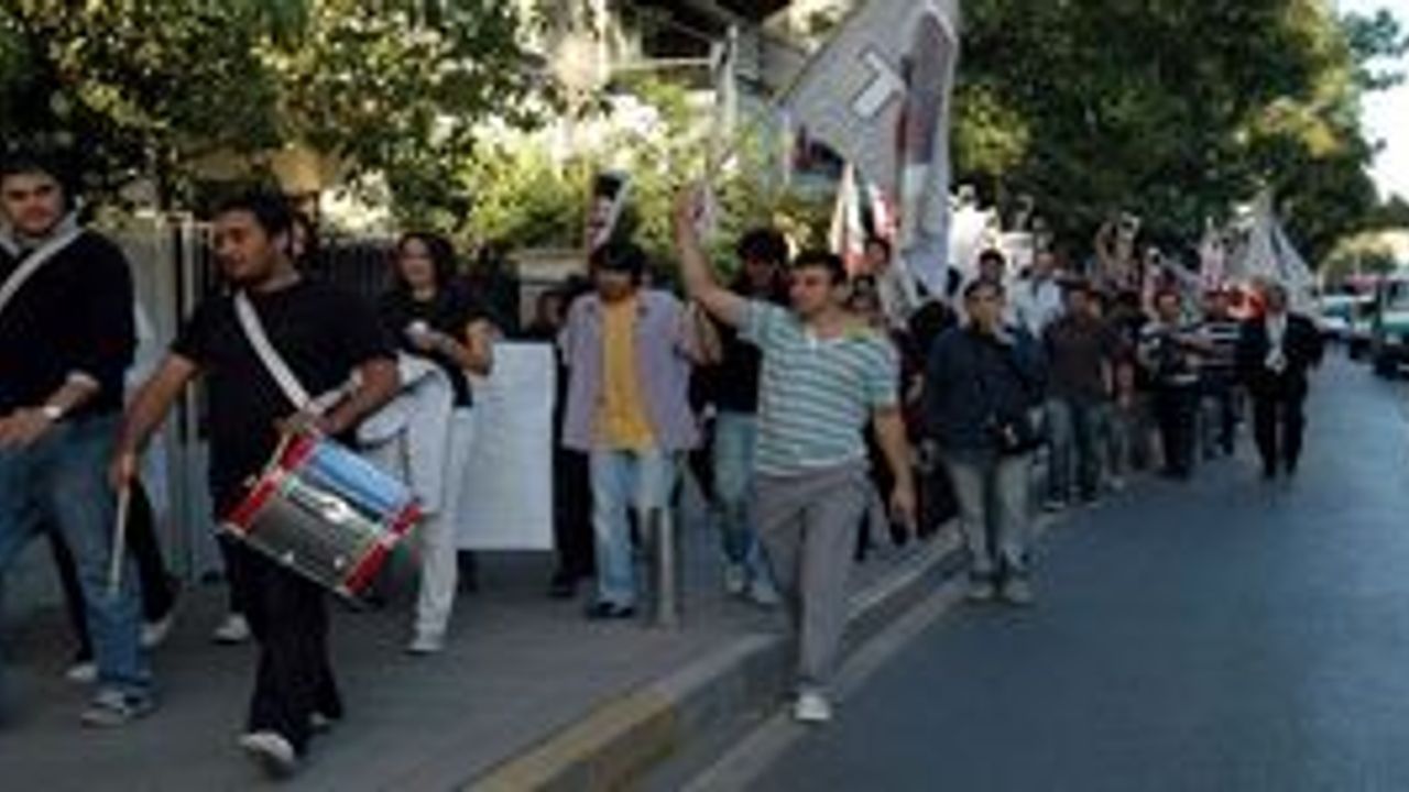 İZMİR - Şirinyer semtindeki Tansaş mağazası önünde toplanan TGB üyeleri, Nato'yu protesto eden slogan atıp pankart açarak yürümeye başladı. Polis ekiplerinin aldığı güvenlik önlemi altında yürüyen TGB üyeleri, Menderes Caddesi'ndeki Nato üssü binasının önüne geldi.