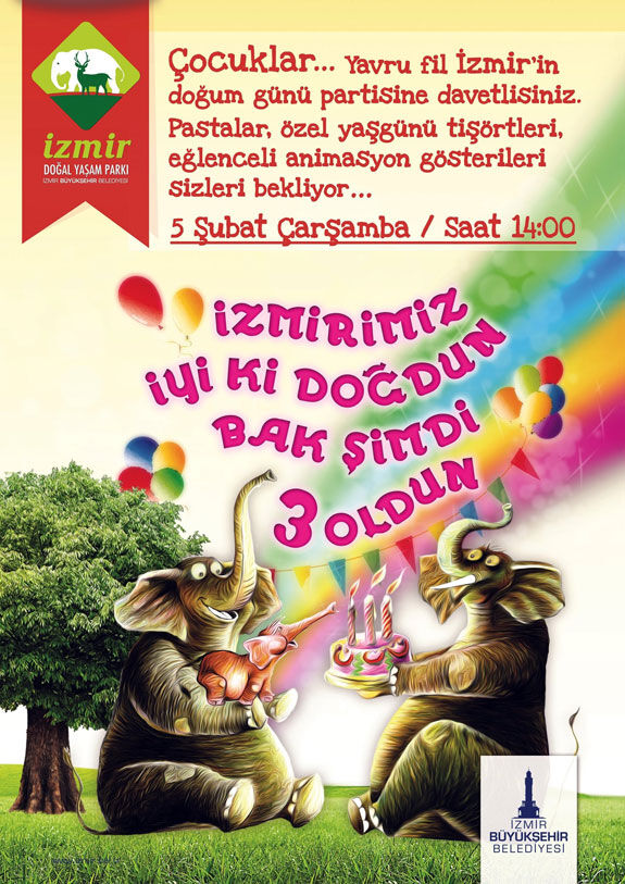5 Şubat 2013 Çarşamba günü saat 14.00'te Doğal Yaşam Parkı'nda düzenlenecek partide, İzmir için özel olarak hazırlanan pasta kesilecek. Partiye katılan çocuklara yine özel olarak hazırlanan yaş günü tişörtleri hediye edilecek. Eğlenceli animasyon gösterileri ve müzik dinletileriyle şenlik havasına dönüşecek kutlamalara tüm çocuklar davetli. İzmir Büyükşehir Belediyesi, İzmir'in doğum günü için Doğal Yaşam Parkı'na gelen çocuklardan o gün ücret almayacak.