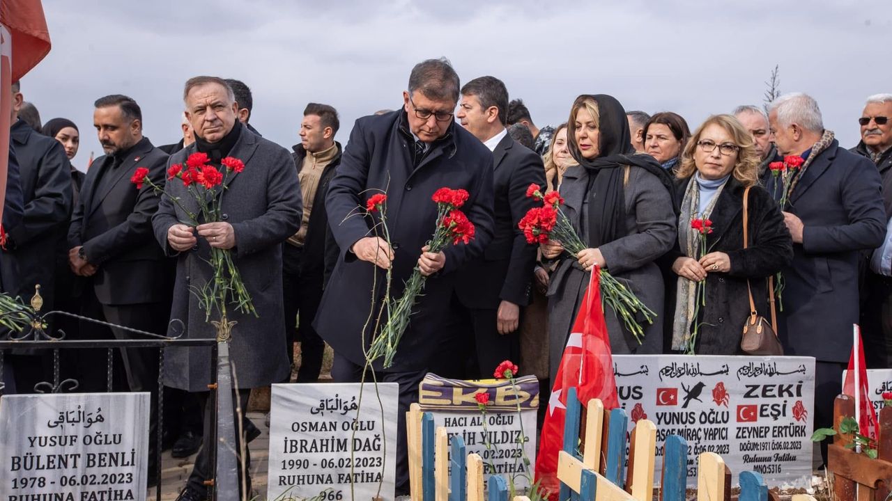 Özgür Özel, yitirilen canlara rahmet dileyerek, bugünün siyaset değil, acıyı hatırlama günü olduğunu söyledi. Özel, "Adıyaman’da resmi kayıtlara göre 8 binin üzerinde kaybettiğimiz canımıza rahmet diliyorum. Tüm Türkiye’de resmi kayıtlara göre 50 binin üzerinde olan şehitlerimize rahmet diliyorum. Adıyaman o günlerde depremden çok fazla etkilenen sokaklarında adım atmanın mümkün olmadığı büyük bir yıkımı yaşamıştı. Abdurrahman Tutdere Başkanımızın yeğenlerini 3 yakınını enkazdan çıkarıp toprağa gömdüğünü görünce rakamların ne kadar gerçek dışı olduğunu hep birlikte gördük. Kefensiz defnedilen, kurallara rağmen DNA vermenin mümkün olmadığı, sayıların birbirine karıştığı bir büyük acının içindeydi o gün. 2 yıl sonra bugün şehitliğimizde deprem şehitlerimizi ziyaret etmek için buradayız. Bugün siyasetin günü değil. Acıyı hatırlamanın ve ders almanın günü" dedi.