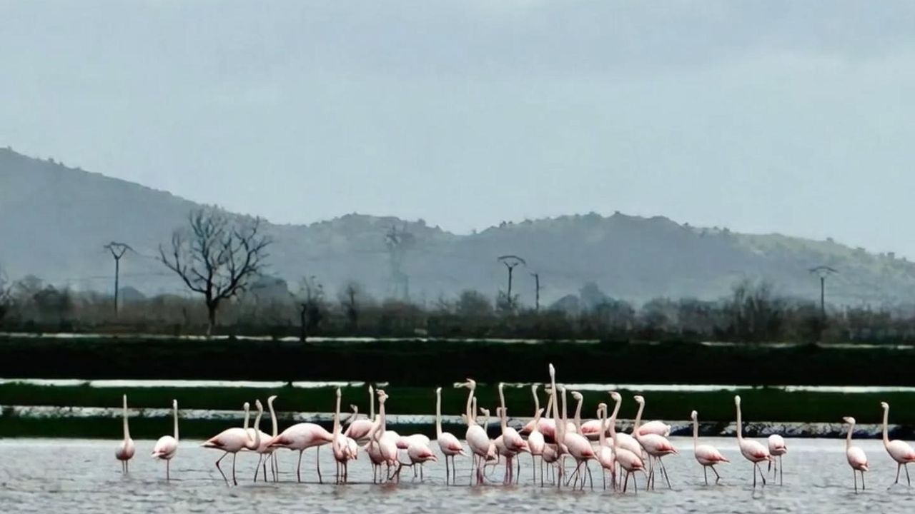 Aydın'da etkili olan sağanağın ardından Büyük Menderes Nehri taştı. Taşkın nedeniyle özellikle buğday ekili bazı tarım arazileri su altında kaldı. Suyu ike kaplanan alanlar sulak alana dönüşürken, bölgeye flamingo sürüsü indi. Koçarlı İlçe Tarım ve Orman Müdürlüğü ekipleri, taşkın nedeniyle bölgede arazi incelemesi yaptığı sırada flamingolarla karşılaştı. Ekipler, kuşların tarlalar üzerindeki görüntülerini cep telefonu kamerasıyla kayda alarak sanal medyada paylaştı. Flamingoların, Yeniköy Mahallesi’ndeki suyla kaplanan arazilerde bir süre yiyecek aradığı görüldü. Taşkının tarım arazilerinde yol açtığı zarara ilişkin incelemelerin sürdüğü öğrenildi. (DHA)