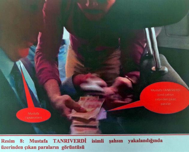 İşadamı da önceden hazırlanarak seri numaraları alınan çanta içerisindeki 200 bin TL ve 300 bin dolar parayı Tanrıverdi'ye teslim etti. İçerisi para dolu çantayı teslim alan Tanrıverdi lokantanın önünden ayrıldığı sırada polislerce gözaltına alındı. Yapılan üst aramasında önceden seri numaraları alınmış 5 bin TL'nin Tanrıverdi'nin iç cebinde olduğu tespit edildi. Operasyon kapsamında şüphelinin Kırıkkale'deki ev ve iş adreslerinde arama yapıldı.