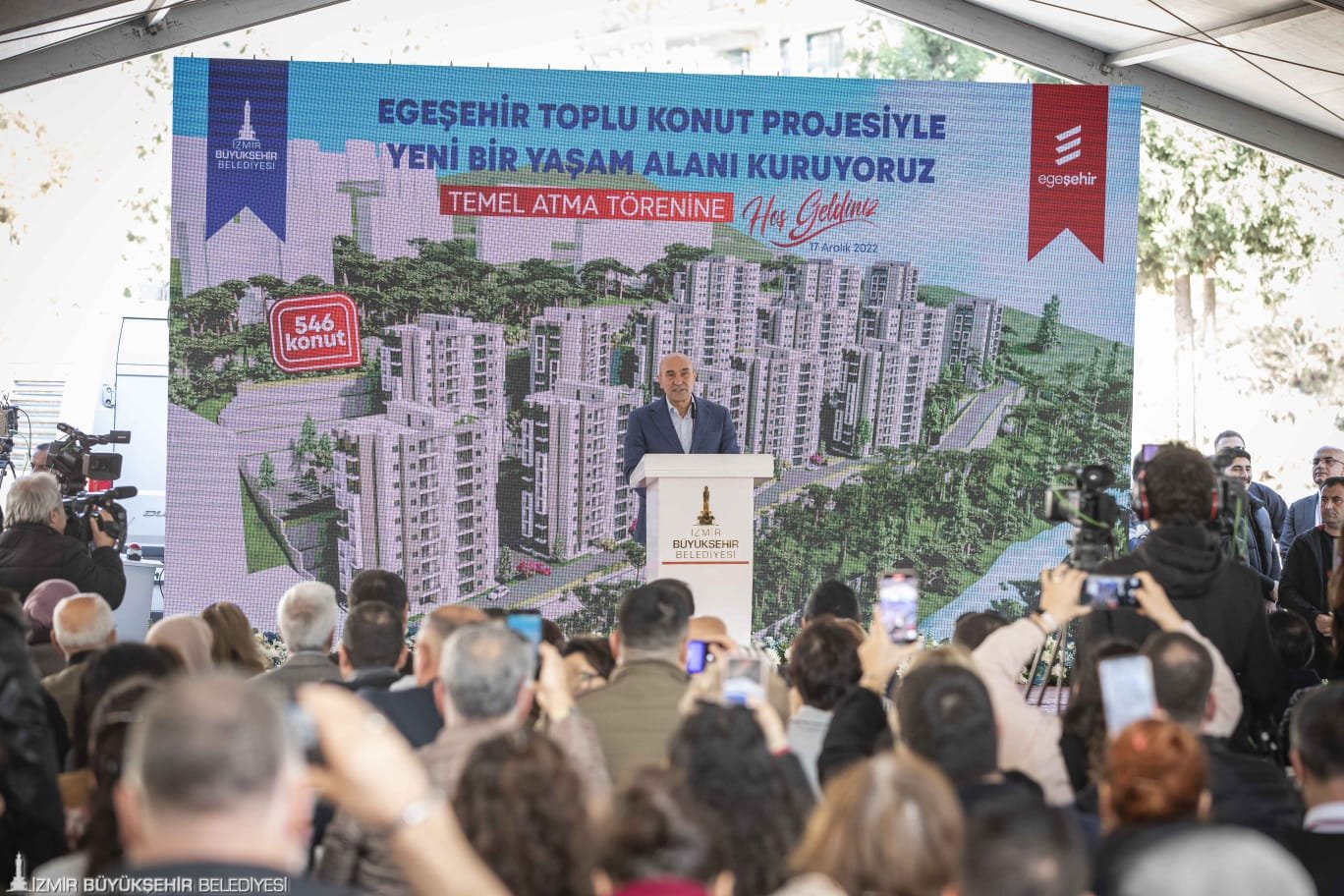Duygusal anların yaşandığı temel atma töreninde konuşan Başkan Tunç Soyer, 'Ekonomik krizin her geçen gün derinleştiği, yoksulluğun ve dahası yoksunluğun arttığı bir dönemde bu değerli projeyi başlatmak hem İzmir hem de belediye emekçileri için çok önemli bir adım. Belediyemizin değerli emekçilerinin hayallerini gerçeğe dönüştürecek çok önemli bir projeyi başlatıyoruz. Bugün burada, 14 adet 10 katlı bloktan oluşan sosyal konut projemizin temelini atıyoruz. Bu projemizle sadece binalar değil, aynı zamanda çalışanlarımız için bir yaşam alanı inşa ediyoruz. EGEŞEHİR Toplu Konut Projesi, önümüzdeki yıl yapımına başlayacağımız Taş Vadi Yaşayan Parkı'nın tam başlangıç noktasında yer alıyor. Önceliğimiz ise güvenlik. Proje kapsamında inşa edilecek her binada, depremlere karşı yapının durumunu sürekli takip edebileceğimiz yapı sağlığı izleme sistemleri kuruyoruz. Her bir detayı ince ince düşünerek, iki buçuk yılda tamamlayacağımız bu projeyle personelimizin ve vatandaşlarımızın hak ettiği bir yaşam alanını burada kuracağız. Bu proje sadece inşa edilen yerleşke açısından değil, aynı zamanda İzmir Büyükşehir Belediyesi EGEŞEHİR şirketimizi canlandırmak için de büyük değer taşıyor. Ege Şehir geçmişte EVKA'lar ve Universiade konutları gibi kent belleğimizde önemli yeri olan projeleri gerçekleştirmişti. Büyükşehir Belediyemizin yeni vizyonuyla bu şirketimizi bir kere daha İzmir'in önemli aktörlerinden biri haline getiriyoruz' dedi.