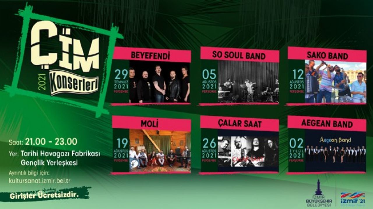 İzmirli müzik gruplarının sahneye çıkacağı Çim Konserleri'nde müzisyenler izleyicilere pop, rock, caz ve Balkan ezgileri gibi farklı türlerde seçkiler sunacak.
