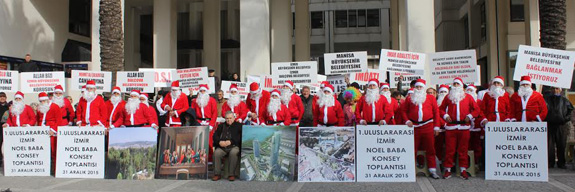 40 yıldır yaşadıkları imar sorununa Avrupa İnsan Hakları Mahkemesi'nde çözüm arayan Balçovalı arsa mağdurları, avukatları Mustafa Kemal Turan'ın çağrısıyla '1. Uluslararası Noel Baba Konseyi Toplantısı' adında eylem yapmak üzere İzmir Büyükşehir Belediyesi önünde toplandı.