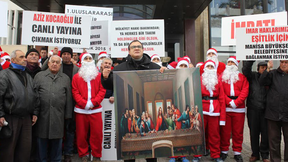'Manisa Büyükşehir Belediyesine bağlanmak istiyoruz', 'imdat', 'S.O.S', 'Allah bizi Balçova Belediyesi'nden korusun', 'İmar adaleti istiyoruz', 'Aziz Kocaoğlu ile canlı yayına çıkmak istiyoruz' yazılı pankart ve dövizlerle toplanan Balçovalı arsa mağdurları giydikleri noel baba kıyafetleri ve çaldıkları yılbaşı şarkılarıyla basın açıklaması yaptı.