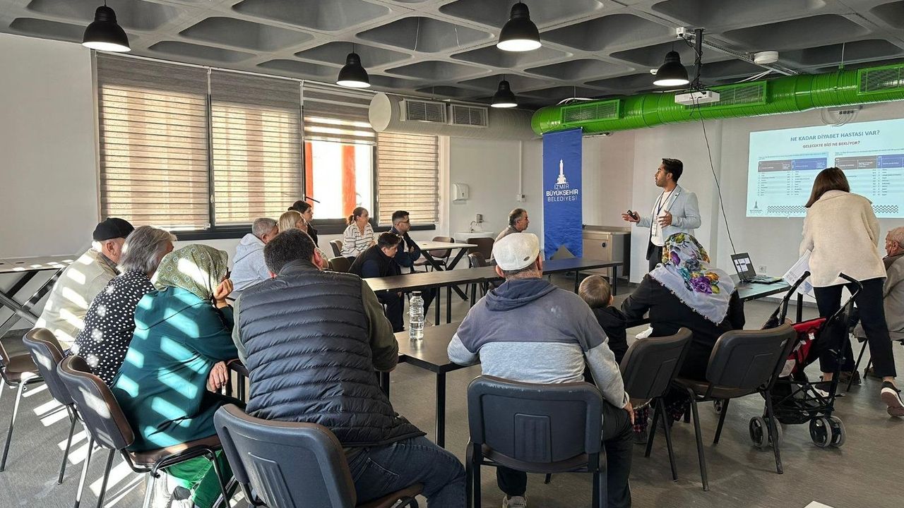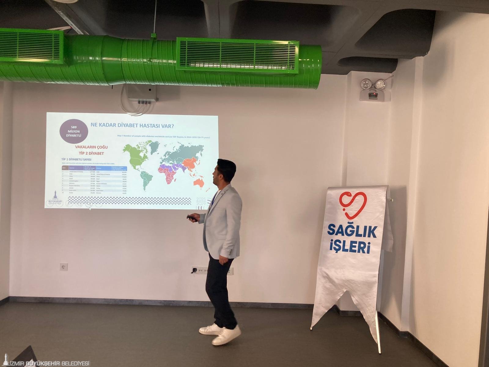 İZSEM’de düzenlenen eğitimde ise Sağlık Eğitimleri Şube Müdürlüğü’nde görevli Diyetisyen Emre Turhan, diyabet farkındalığını artırmak ve diyabet eğitimini yaygınlaştırmak için köy köy, mahalle mahalle diyabet farkındalığı eğitimleri düzenlediklerini belirtti. Turhan, “Bu eğitimlerde diyabetin nasıl bir hastalık olduğu, diyabette beslenme, fiziksel aktivite ve öz bakımın önemini anlatıyoruz. Şeker hastalarının en büyük korkularından birisi de ‘yediklerimiz kan şekerimi yükseltir mi?’ korkusudur. Bu noktada diyabet hastalarının özellikle karbonhidratlardan korkmamaları gerekir. Burada önemli olan kan şekerini yavaş yükselten kompleks karbonhidratları tüketmektir. Kompleks karbonhidratlar tam tahıllar, kuru baklagiller, sebzeler ve meyvelerde bulunur. Yüksek şeker zarar verir, düşük şeker öldürür. Bu nedenle şeker hastalarının hipoglisemi tehlikesine karşın mutlaka yanlarında kan şekerini hızlı artıracak karbonhidratları taşımaları ve ara öğün yapmaları çok önemlidir. Yine kan şekeri ölçümü yapmak hayat kurtarır. Beslenmenin düzenlenmesi için bir diyabet diyetisyenine gidilmesinin yanı sıra hekimin verdiği ilaçları düzenli kullanmak ve düzenli hekim kontrolüne gitmek de çok önemlidir” dedi.