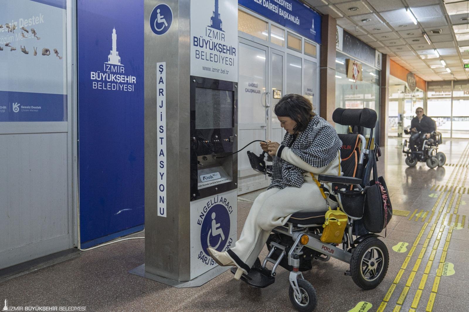 İzmir Büyükşehir Belediyesi Engelli Çalışmaları Şube Müdürlüğü’ne bağlı Tekerlekli Sandalye Bakım Onarım İstasyonu, engelli vatandaşlara verdiği ücretsiz hizmetle önemli bir ihtiyacı karşılıyor. Tekerlekli sandalyeleri bozulan yurttaşlar, yolda kaldıklarında 0232 293 98 24 numaralı telefon ya da 153 Hemşehri İletişim Merkezi’ne ulaşarak destek istiyor. İhbarın ardından ekipler, engelsiz ulaşım araçlarıyla yurttaşın bulunduğu adrese gidiyor. Onarım gerektiren sandalyeleri ile Konak Hizmet Merkezi’nde bulunan istasyona ulaşan yurttaşlara, tamir süresi boyunca ücretsiz yedek tekerlekli sandalye temin ediliyor. Böylece yurttaşların günlük yaşamları kesintiye uğramıyor. İstasyon yalnızca tamir değil, düzenli bakım hizmeti de sunuyor. Konak Hizmet Merkezi’nde ayrıca akülü tekerlekli sandalyeler için şarj istasyonu da bulunuyor.