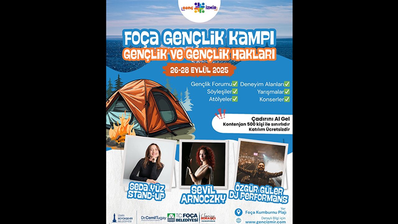İzmir Büyükşehir Belediye Başkanı Dr. Cemil Tugay’ın “genç dostu kent” vizyonuyla 26-28 Eylül tarihlerinde dopdolu bir gençlik kampı programı hazırlandı. Foça’nın Kumburnu Plajı’nda 3 gün sürecek çadır kampı süresince katılımcılar hem üretecek hem bol bol eğlenecek. Gençlik forumunda fikir alışverişinde bulunacak katılımcılar deneyim alanlarında pratik bilgi edinecek, söyleşilerle ilham alacak ve atölyelerde yaratıcılıklarını ortaya koyacak. İzmir Büyükşehir Belediyesi ile Foça Belediyesi iş birliğiyle yapılacak kamp kapsamında konserler ve eğlenceli performanslar olacak.