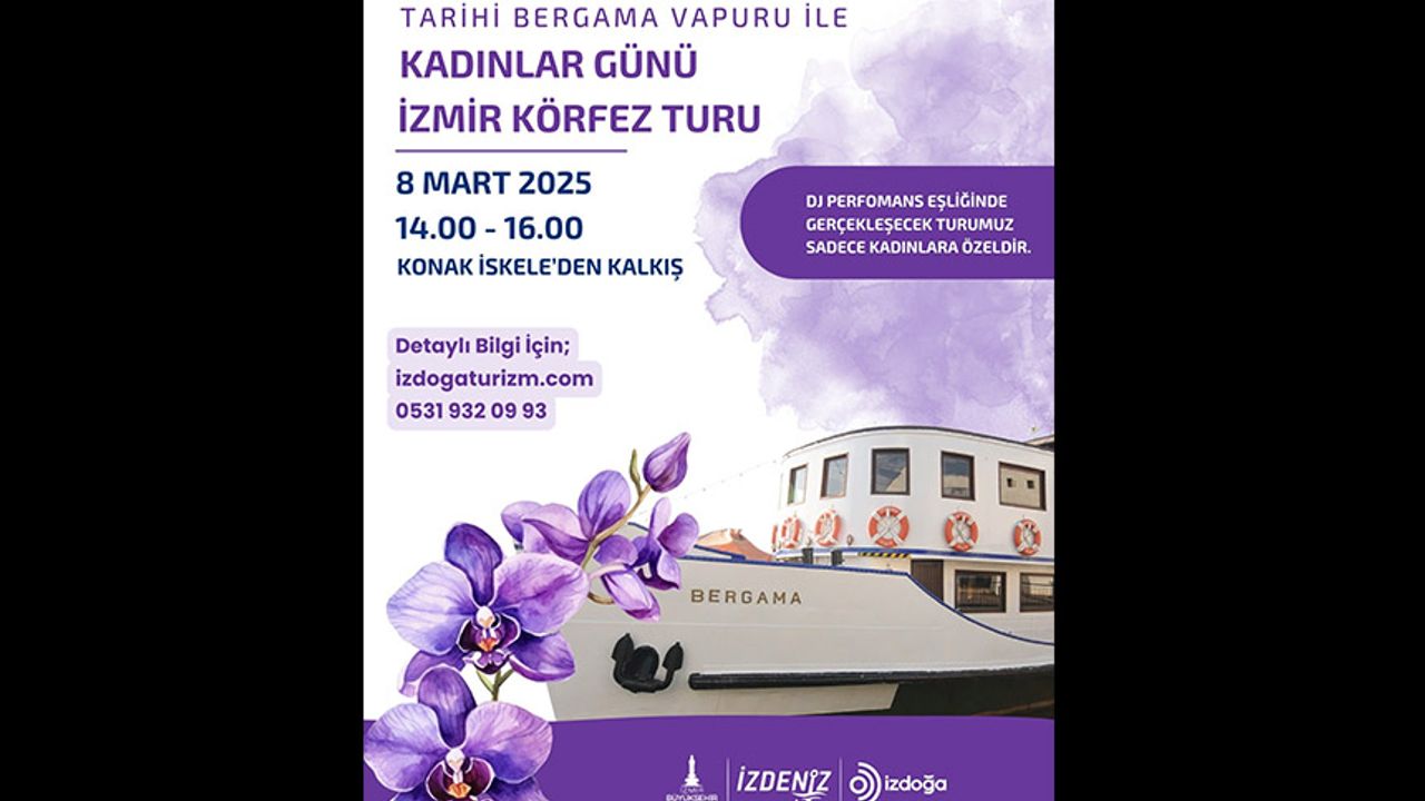 İzmir Büyükşehir Belediyesi şirketleri İZDENİZ ve İZDOĞA ortaklığında tarihi Bergama Vapuru ile Körfez’de düzenlenen turlar 8 Mart Dünya Emekçi Kadınlar Günü’ne özel programla devam edecek. Sadece kadınlara özel tur 8 Mart 2025 Cumartesi günü 14.00 ile 16.00 saatleri arasında olacak. Konak Vapur İskelesi’nden hareket edip yine aynı iskelede sona erecek tur boyunca kadınlar DJ performansı eşliğinde keyifli vakit geçirecek.
