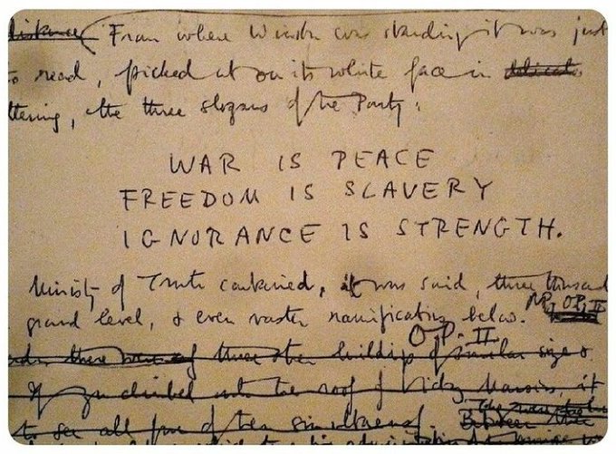Gençlerle yaptığımız sohbetlerde George Orwell'in el yazısıyla 1984'ün taslağından bir sayfayı gösteririm sunumlarımda; Savaş barıştır, Özgürlük köleliktir, Cahillik güçtür.