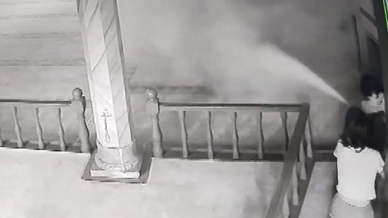 Gençlerin yangın tüpünü birbirinin üzerine sıktığı anlar güvenlik kamerasına yansıdı. (DHA)