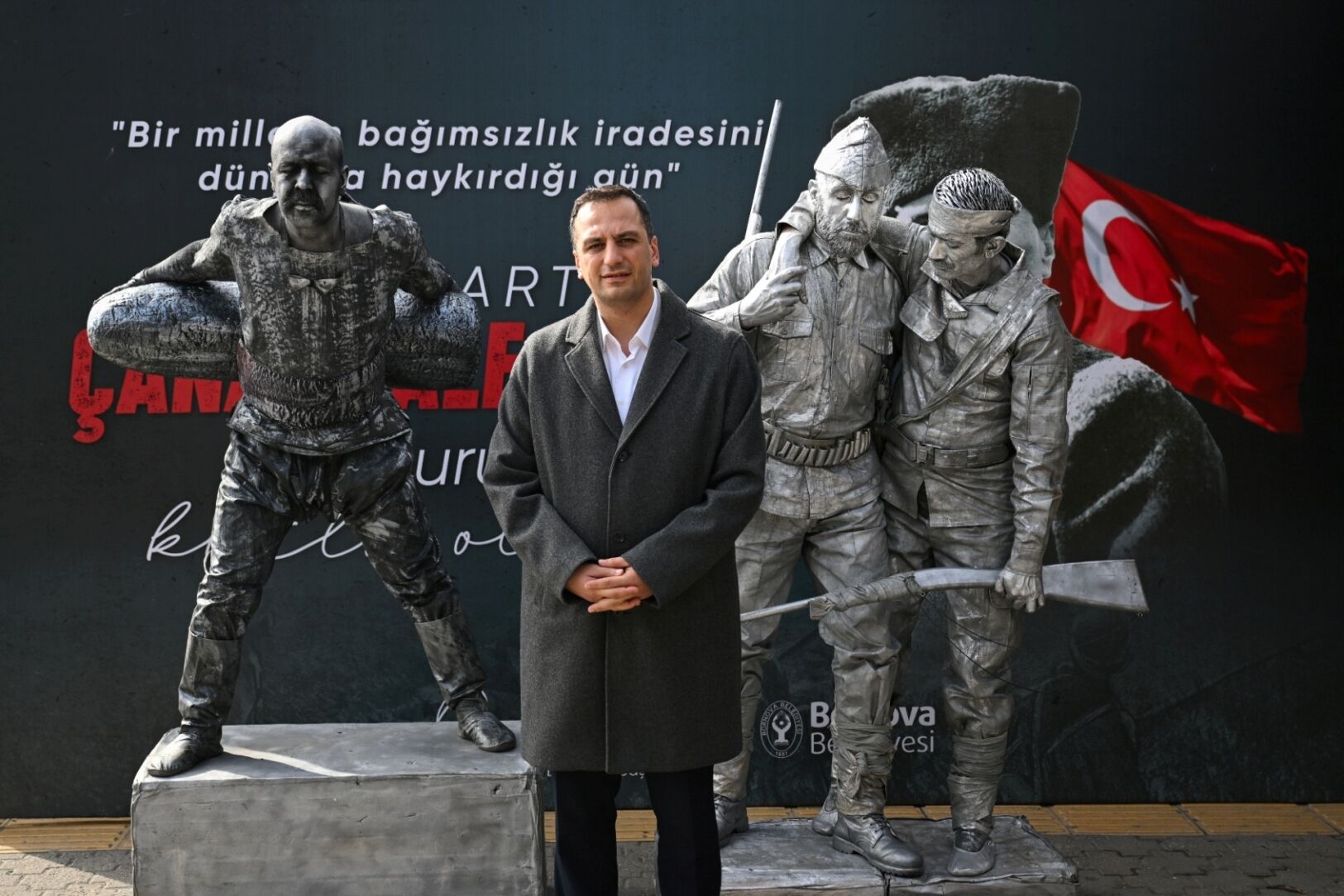 Şehitlikteki törenin ardından Bornova Metro İstasyonu çıkışında sahnelenen canlı heykel performansı, vatandaşlardan büyük ilgi gördü. Çanakkale Savaşı’ndan sahnelerin canlandırıldığı performans, izleyenlere duygu dolu anlar yaşattı.