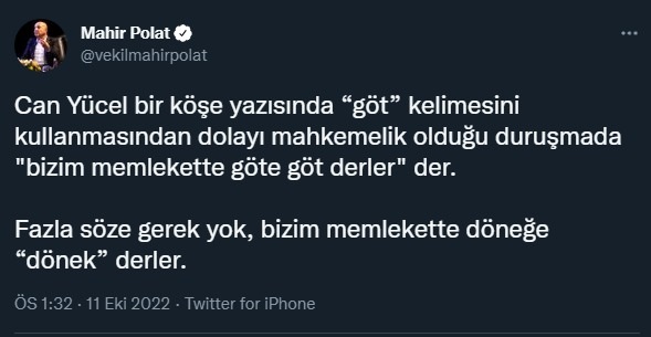 Polat'ın bu açıklamadan iki saat sonra paylaşımını kaldırdığı görüldü. Polat yaptığı açıklamada 'Can Yücel'in meşhur savunmasında neye ne dendiğini hepimiz biliyoruz. Bizim memlekette de döneğe 'dönek' denir' ifadelerini kullandı.