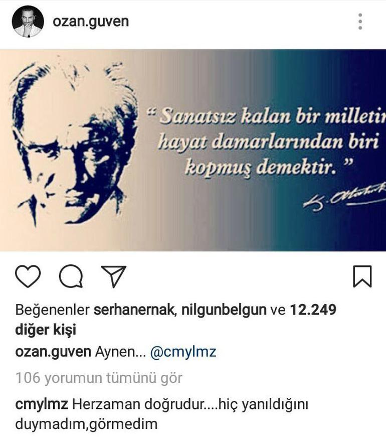 Şu ara 'Fi' dizisinde oynayan Ozan Güven, sosyal medya hesabından yaptığı bir paylaşımla dikkat çekti. Atatürk'ün sanatla ilgili bir sözünü paylaşan Ozan Güven bu paylaşımıyla ilgili çok sayıda yorum aldı. Bu yorumlardan biri de yakın dostu Cem Yılmaz'a aitti.
