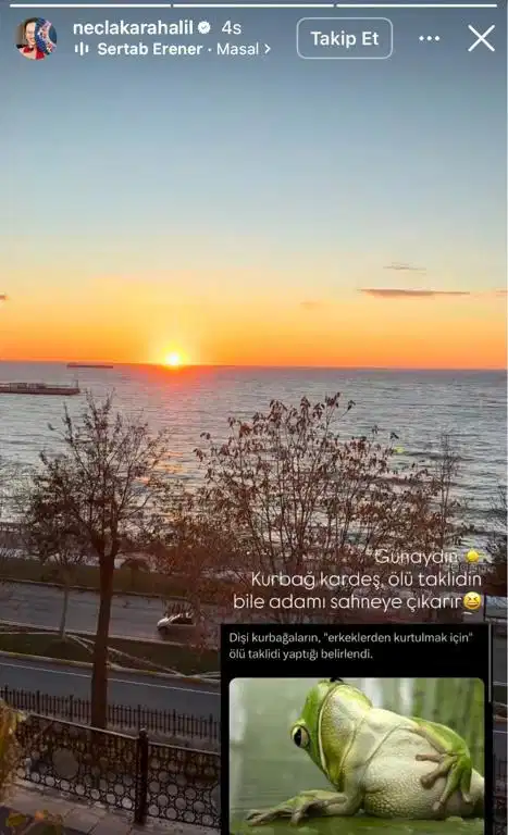 Necla Karahalil, Instagram hikayesinde, “Dişi kurbağaların, 'erkeklerden kurtulmak için' ölü taklidi yaptığı belirlendi” ifadesinin yer aldığı bir paylaşıma yer verdi.