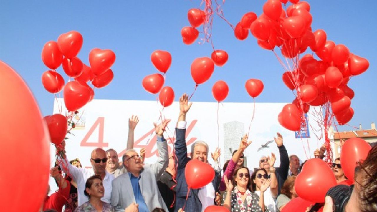 Kortej sonrası etkinlik alanına gelen Çeşme Belediye Başkanı Muhittin Dalgıç, kalp şeklindeki balonları gökyüzüne saldı.