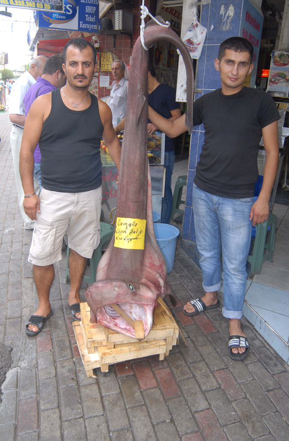 Köpek balığını iki gün boyunca Üçyol semtindeki işyerinin önünde sergileyeceğini söyleyen Yüksel İnce, 'İnsanların en merak ettiği türlerden birisi olan köpek balığını inceleme fırsatı vermek için sergiledik. İkinci günün sonunda balığı kaldırarak müşterimiz olan otellere satacağız' dedi.(DHA)
