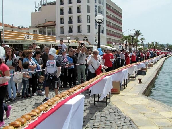 Çeşme Noteri gözleminde ölçülen ve tek tek sayılan hamburgerler, onayının ardından Çeşme sahilinde rekor denemesine tanıklık edenler tarafından kapışıldı. Video kaydı da alınan rekor denemesi, Çeşme Noteri'nin tespit yazısı ile birlikte onay için, dünya rekorlarını tescilleyen tek kurum olan Guiness'e gönderilerek tescillenmesi beklenecek. Dünyanın en uzun hamburgeri rekor denemesi, dron ile havadan da görüntülendi. Rekor denemesine, Çeşme Kaymakamı Mustafa Erkayıran, Belediye Başkanı CHP'li Muhittin Dalgıç, İzmir Esnaf ve Sanatkarlar Birliği Başkanı Zekeriya Mutlu ve Çeşme Esnaf ve Sanatkarlar Odası Başkanı Osman Köfüncü de tanıklık etti.