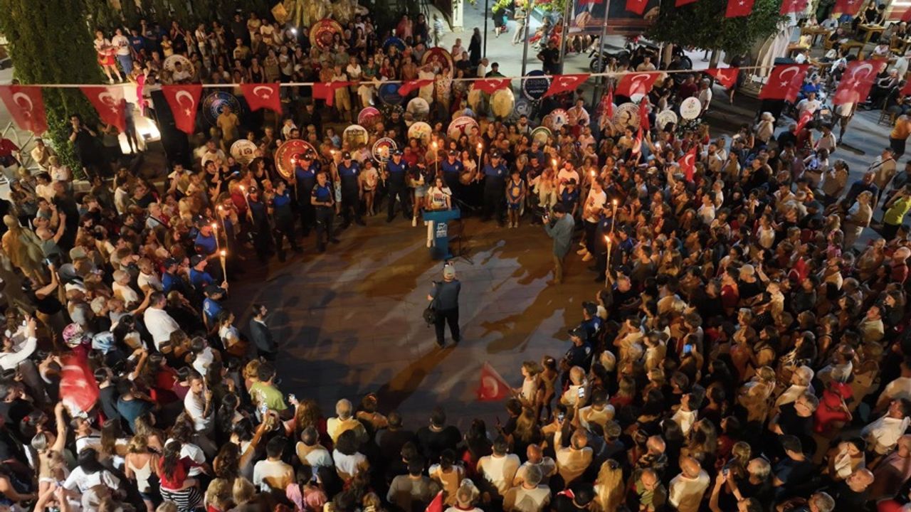 Uğur Mumcu Parkı’nda bir araya gelen Çeşmeliler, ellerinde meşaleler ve bayraklarla marşlar eşliğinde Cumhuriyet Meydanı’na yürüdü. Meydanı dolduran kalabalık, zaferin 103. yıl dönümünde milli birlik ve beraberlik ruhunu hep birlikte yaşadı.