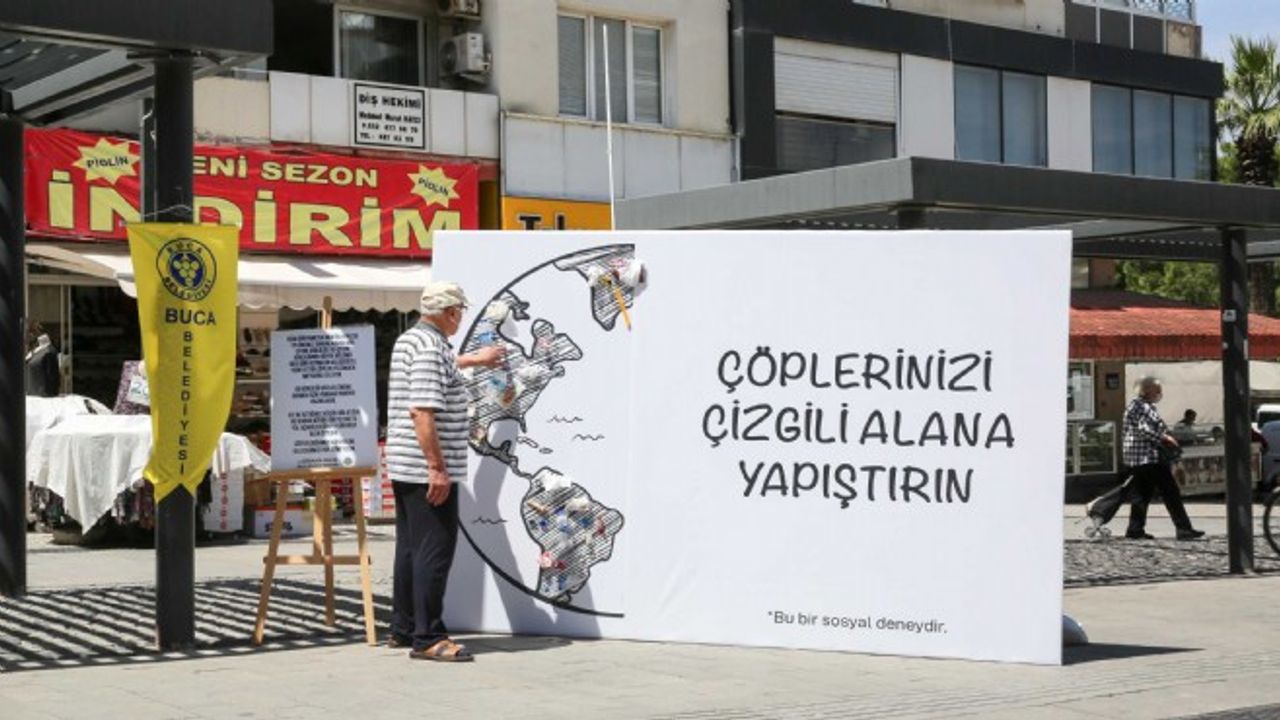 İzmir'in en kalabalık ilçesi Buca'da, giderek artan çevre kirliliğiyle ilgili ilginç bir farkındalık çalışması yapıldı. En fazla yoğunluğun yaşandığı Forbes Caddesi girişine ikiye bölünmüş dünya görseli yerleştiren Buca Belediyesi, vatandaşlardan çöplerini bu panoya yapıştırmasını istedi.