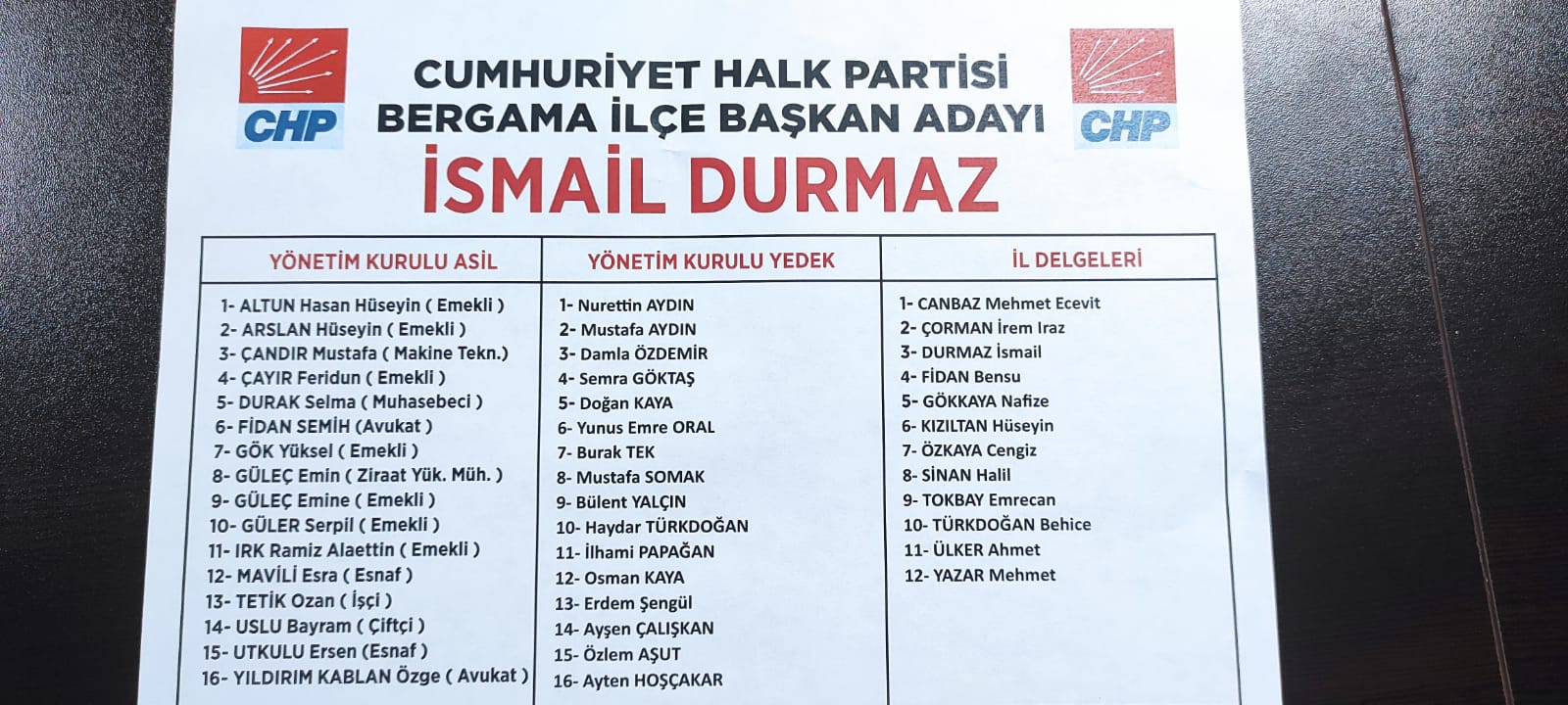 Bergama'da Cumhuriyet Halk Partililerin, İsmail Durmaz'ın adaylığı konusunda birleştiği, başka bir adayın son anda ortaya çıkarak sürpriz yapma ihtimalinin olmadığı öğrenildi. Canbaz'ın belediye başkanlığını düşündüğü, kendi yönetiminde yer alan İsmail Durmaz'ı desteklediği öğrenildi.