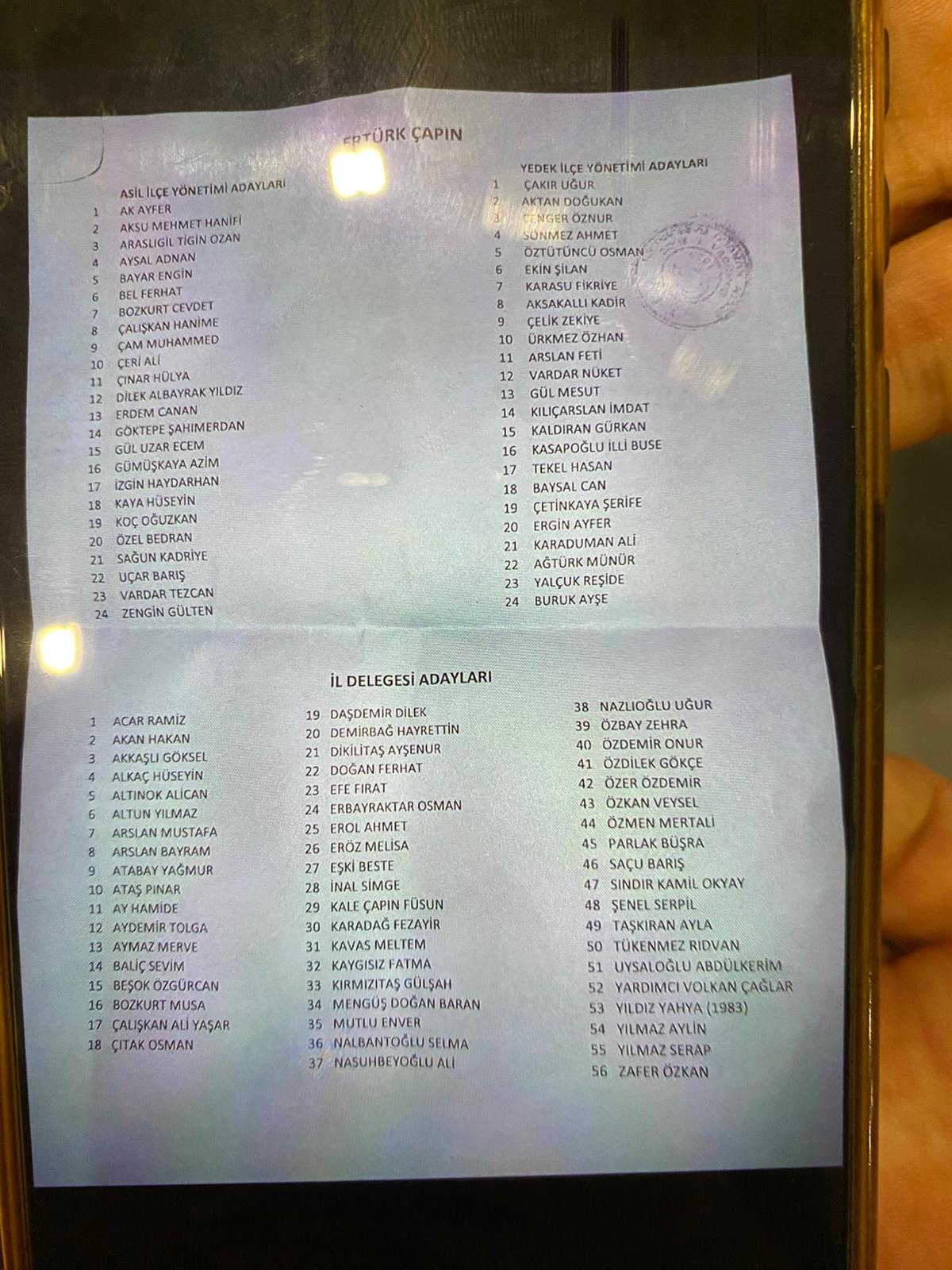Ertürk Çapın'ın listesi de belli oldu. Bornova Belediye Başkanı Ömer Eşki'nin eşi Beste Eşki, CHP eski İzmir milletvekillerinden Kamil Okyay Sındır ve Bornova Belediyesi'nde örgütlü Genel İş İzmir 7 Nolu Şube Başkanı Uğur Nazlıoğlu il delege listesinde yer aldı. Ertürk Çapın ve Ömer Eşki il delegesi listesinde yer almadı.