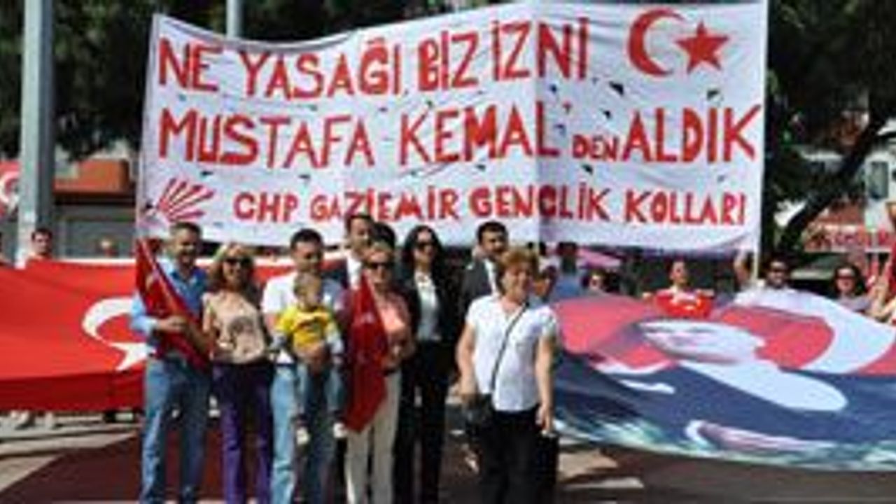 Türk bayrakları ve Atatürk posterleriyle yürüyen ve sık sık slogan atan grubun taşıdığı, 'Ne yasağı, biz izini Mustafa Kemal'den aldık' posteri vatandaşların dikkatini çekerek, alkış topladı. CHP Gaziemir İlçe Başkanı Umut Tekin, ilçe yöneticileri, kadın ve gençlik kolları, belediye meclis üyelerinin katıldığı törene, Gaziemir Belediye Başkanı Halil İbrahim Şenol ve eşi Birsen Şenol'da katıldı. Alternatif tören meydandaki Atatürk büstüne çelenk ve karanfil sunumunun ardından son buldu.