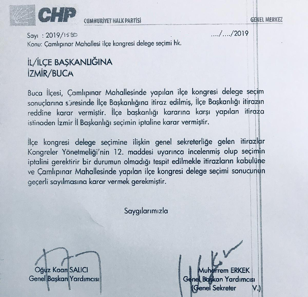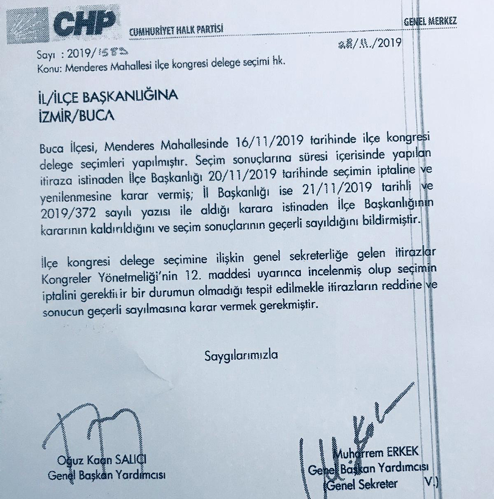 'Buca Menderes Mahallesi'nde 16.11.2019 tarihinde ilçe kongresi delege seçimleri yapılmıştır. Seçim sonuçlarına süresi içerisinde yapılan itiraza istinaden İlçe Başkanlığı 20.11.2019 tarihli ve 2018/372 sayılı yazısı ile aldığı karar istinaden İlçe Başkanlığının kararının kaldırıldığını ve seçim sonuçlarını geçerli sayıldığını bildirmiştir.