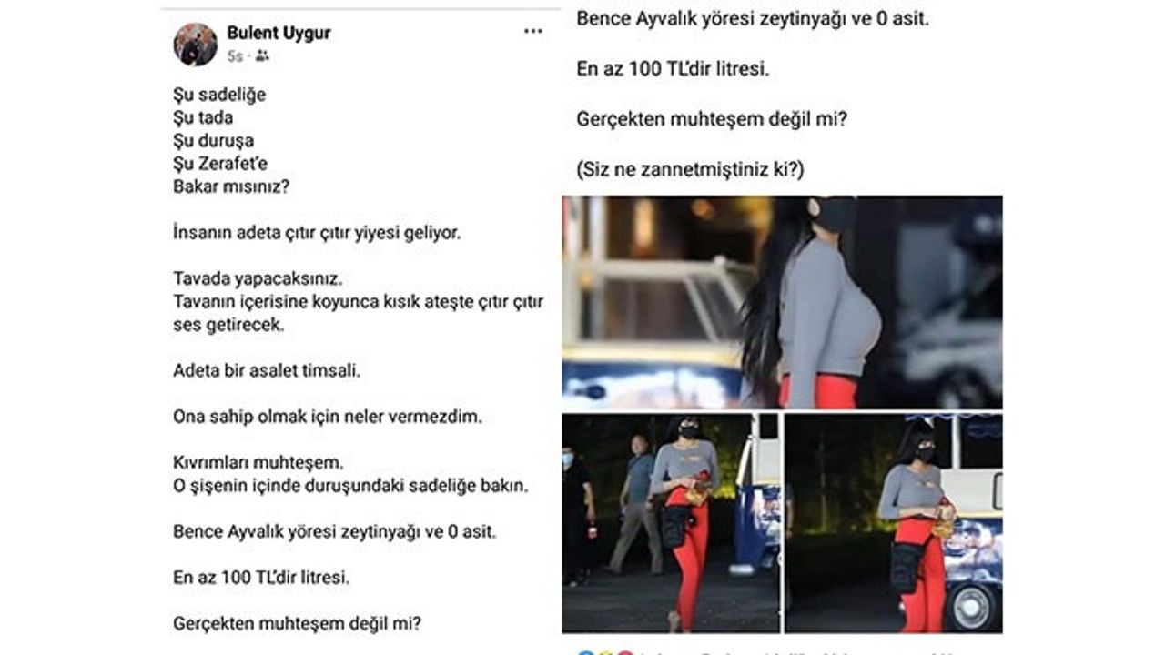 Sosyal medya hesabından kadın fotoğrafları kullanarak, 'Şu sadeliğe, Şu tada, Şu duruşa, Şu Zerafet'e. Bakar mısınız? İnsanın adeta çıtır çıtır yiyesi geliyor. Tavada yapacaksınız. Tavanın içerisine koyunca kısık ateşte çıtır çıtır ses getirecek. Adeta bir asalet timsali. Ona sahip olmak için neler vermezdim. Kıvrımları muhteşem. O şişenin içinde duruşundaki sadeliğe bakın. Bence Ayvalık yöresi zeytinyağı ve 0 asit. En az 100 TL'dir litresi. Gerçekten muhteşem değil mi? (Siz ne zannetmiştiniz ki?)' ifadelerini kullandı.