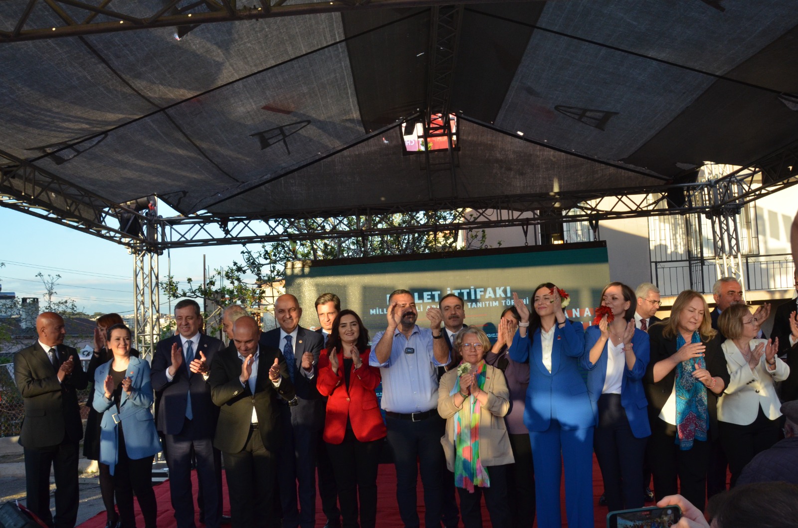 İlk olarak kürsüye çıkan CHP İzmir İl Başkanı Şenol Aslanoğlu, 'Muhteşem gözüküyorsunuz... Pazaryerini gelincik tarlasına çevirmişsiniz. Sizler saraylara layıksınız ancak tarih boyunca sarayla hiç halkına hizmet etmemiş, 3-5 seçkine hizmet etmiş. Bu nedenle bizim gözümüz saraylardan yana olmayacak. Halktan yana olanların sarayı hiçbir olmayacak. Biz Cumhuriyeti Ankara'da Keçiören'de odun sobalı bir binada kurduk. Onlar kendi aileleri için 5'li çete için bin 550 odalı saray yaptırdılar. Yetti mi o saray onlara? Yetmedi. Gittiler kışlık saray yaptılar. O onları doyurdu mu? Doyurmadı. Onlar büyük bir doğa katliamı yaprak yazlık saray yaptırdılar. Sizlerin parası ile yaptırdılar. Sonra da size dönüp 'ey milletim sizin için saray yaptırdık' dediler. Aranızdan biri bile o saraylarda kaldı mı? O sarayların kapısının içine girebilen var mı? Neyinize yetmedi Çankaya Köşkü? Atatürk'e yeten Çankaya Köşkü neyinize yetmedi. Ancak çok az kaldı Cumhuriyeti fabrika ayarlarına döndürmemize az kaldı. O sarayları lüks düşkünlerinin alıp halkımıza vermeye az kaldı. Bundan önce ilk olarak Kılıçdaroğlu'nun cumhurbaşkanı yaparak Çankaya Köşkü'ne göndermemiz gerekiyor. Soğanı 30 TL yapanlara inat pazar yerindeyiz. Saray olmadan yaşayamayanlar dün iftarını 5 yıldızlı otelde açtı. Millet ittifakı ise Halil İbrahim sofrasını Konak meydanında kurdu. Onlarla bizim aramızda kocaman bir fark var. Onlar adaylarını saraylarda 5 yıldızlı otellerde tanıtılar biz Limontepe'de halkımız ile tanıtıyoruz. Birkaç gündür çıkmışlar bayrak, vatan Atatürk bizim kırmızı çizgimiz diyorlar. 21 yıldır Atatürk'ün adını ağzına almayanlar kalkmış bize vatan dersi veriyorlar. Kaldırın bayraklarınızı. Kim vatanını daha çok seviyor görsünler' diye konuştu.