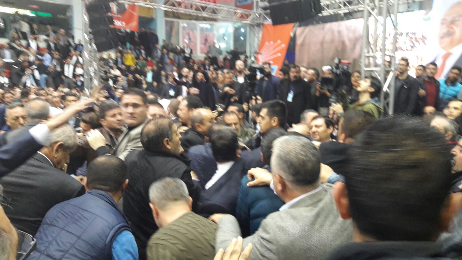 Bir partili Gümrükçü'nün konuştuğu sırada kürsüye doğru koştu. Milletvekili Tacettin Bayır ve Genel Başkan Yardımcısı Erdal Aksünger şahsa müdahale etti. Ardından ortalık karıştı. Kavganın sahne önünde Utku Gümrükçü'ye karşı pankart açılmasından ötürü çıktığı öğrenildi. 2015 genel seçimleri döneminde Atilla Sertel'i Basın İlan Kurumu (BİK) Genel Kuruluna katıldığı gerekçesiyle şikayet eden ve adaylığının düşmesine yol açan CHP Çiğli İlçe Örgütü üyesi Ozan Çelik'in, Gümrükçü'ye 'Kerbela şehitlerinden özür dile' yazılı pankart açtığı öğrenildi.