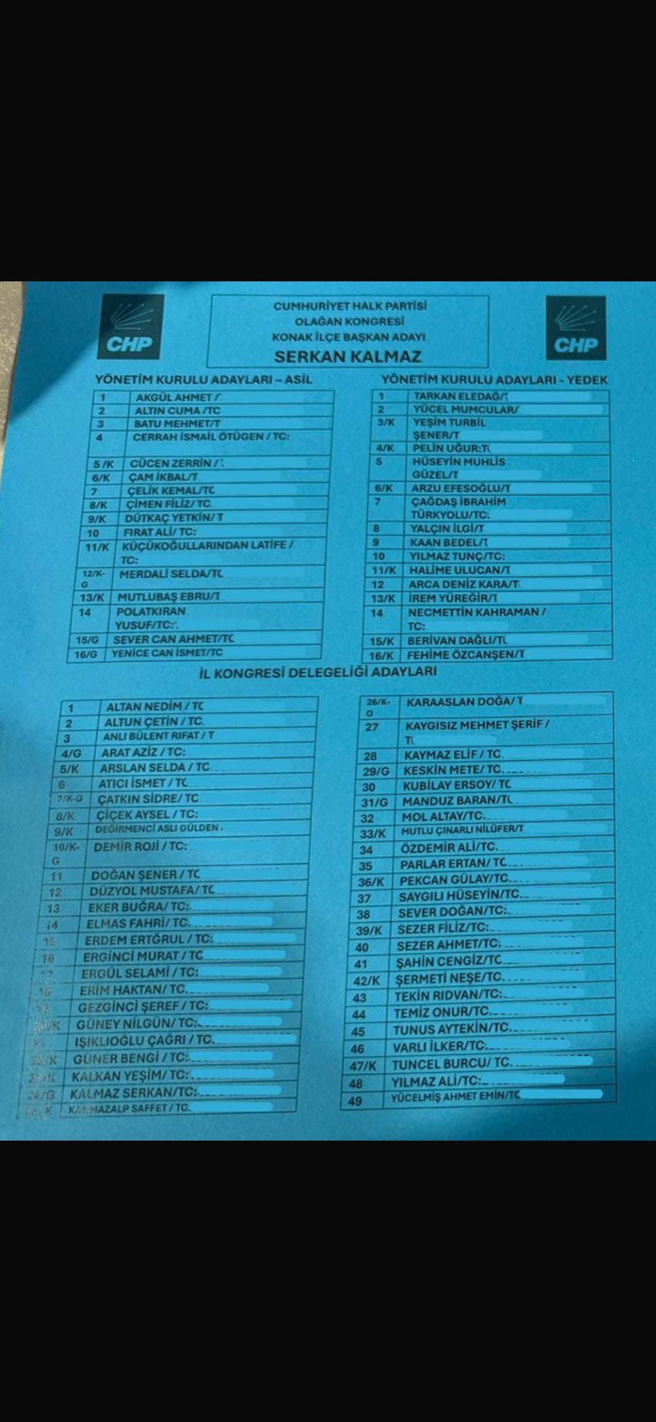 ‘İthal aday’ eleştirilerinin yöneltildiği Mavi listenin adayı Serkan Kalmaz adaylık konuşmasında, “Bugün burada sıradan bir kongrede değiliz. Bugün adaletin sesi Konak’tan yükselmelidir. 15 milyonu vatandaşımız oyu ile Cumhurbaşkanı Adayımız olan Ekrem İmamoğlu başta olmak üzere cezaevlerinde haksız yere tutulan belediye başkanlarımıza bin selam olsun. Biz bu salonda yalnızca seçimi konuşmuyoruz. Cumhuriyetin geleceğini, evlatlarımızın yarınlarını konuşuyoruz. Burada Hasan Tahsin’in ilk kurşunu var. Burada bedel ödemiş tüm devrimci arkadaşlarım var. Konak yalnızca bir ilçe değildir. Konak CHP’nin atan kalbidir. Türkiye’nin küçük modelidir. Konak bize şunu söyler, Konak ayağa kalkarsa Türkiye ayağa kalkar. Ben örgütün bağrından geldim. Ne dışarıdan atandım ne de tepeden indim. Oradan geldin, buradan geldin diyen arkadaşlara söylemek istiyorum. Ben Tunceli’den geldim, Mardin’den, Kars’tan, Konya’dan geldim. Konaklı olmaya geldim. Hak, hukuk, adalet mücadelesiyle Kemal Kılıçdaroğlu’ndan geldim. Genel Başkanımız Özgür Özel’den geldim” dedi.