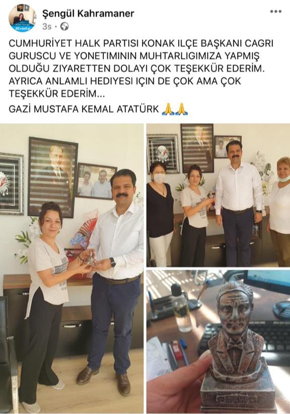 Bahsekonu görüntü Konak ilçemizin Ulubatlı Mahalle Muhtarı Şengül Kahramaner'e yapılan nezaket ziyareti sonunda kendisine verilen minyatür hediyeliğe aittir. Bu ziyaretler ilçe kongremizi takiben 16-31 Mart aralığında planlanmış ancak dünyayı etkisi altına alan Covid-19 salgını nedeniyle ertelenmişti. Ziyaretlerin 18 Mart Çanakkale Zaferi haftasında planlanması nedeniyle muhtarlarımıza Mustafa Kemal'in Çanakkale'de Kurmay Albay olarak verdiği mücadeleyi hatırlatan minyatürler bastırıldı ve Çanakkale Zaferine ilişkin tarihi yayınlar dağıtılacaktı. Ancak o dönem salgın nedeniyle dağıtamamıştık. Muhtarlarımızın tamamına bu ziyaretlerimizdeki gecikmenin nedeni de paylaşılmıştır.