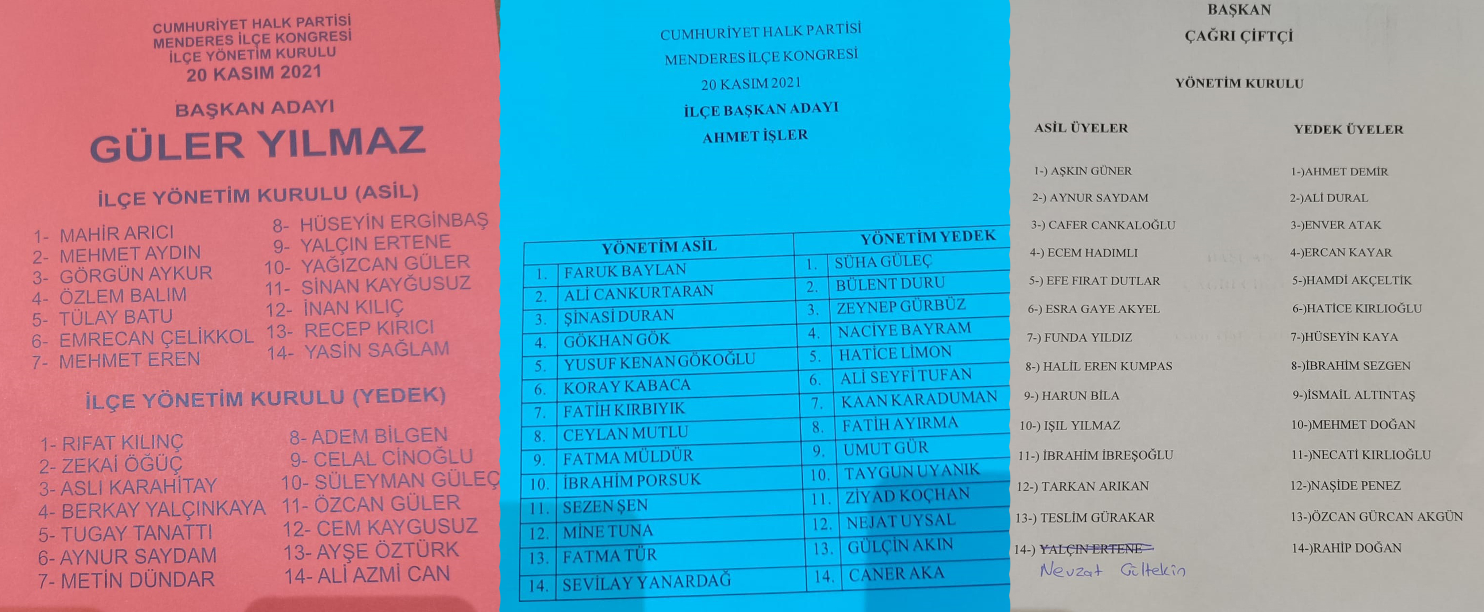 Geçici yönetimin belirlenmesinin ardından parti tüzüğü gereği ilçe kongresi tarihi belirleyen Menderes'te partililer bugün sandık başına gidecek. Menderes Belediyesi Nikah Dairesi'nde gerçekleştirilecek ilçe kongresinde geçici yönetim olarak atanan Karabacak aday olmayacağını açıklarken, Saat 12.30'de başlayan kongrede, kongre öncesi aday olacaklarını açıklayan Kemal Koç yönetiminden istifa edenler arasında yer alan isimlerden biri olan Ahmet İşler ile Ziraat Mühendisi Güler Mutlu Yılmaz ve Çağrı Çiftçi kongre için yeterli imzayı toplayarak adaylığı kabul edildi.