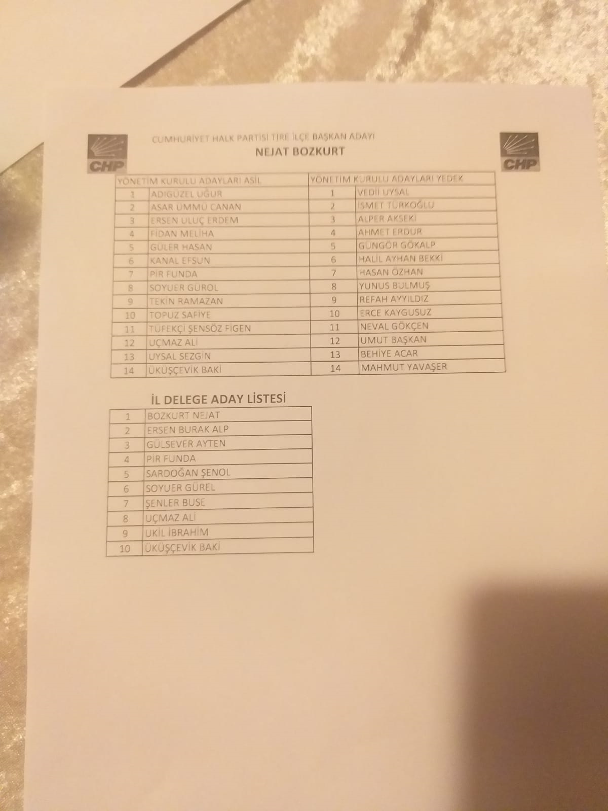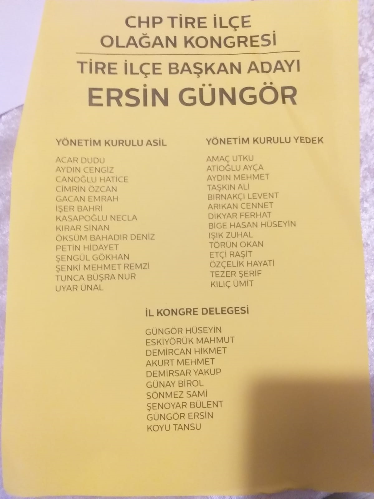CHP Tire Örgütü şahıslara, ailelere, kendi cebini doldurmak isteyenlere, işini düzeltmek için partimizi basamak yapanlara teslim edilmemelidir. CHP Tire'de bir vizyon partisi haline gelmelidir. Her yerde olmalı ve temsil edilmelidir. Partimiz Tire'de itibarlı olmalıdır. Odalarda, derneklerde, ilçe belediyesinde, büyükşehir belediyesinde söz sahibi olmalıdır. Partili üyelerimizin ve delegelerimizin arkasında sonuna kadar gece gündü durulmalıdır. Telefonlarına cevap verilmelidir. İşleri, sorunları hızlıca çözülmelidir.