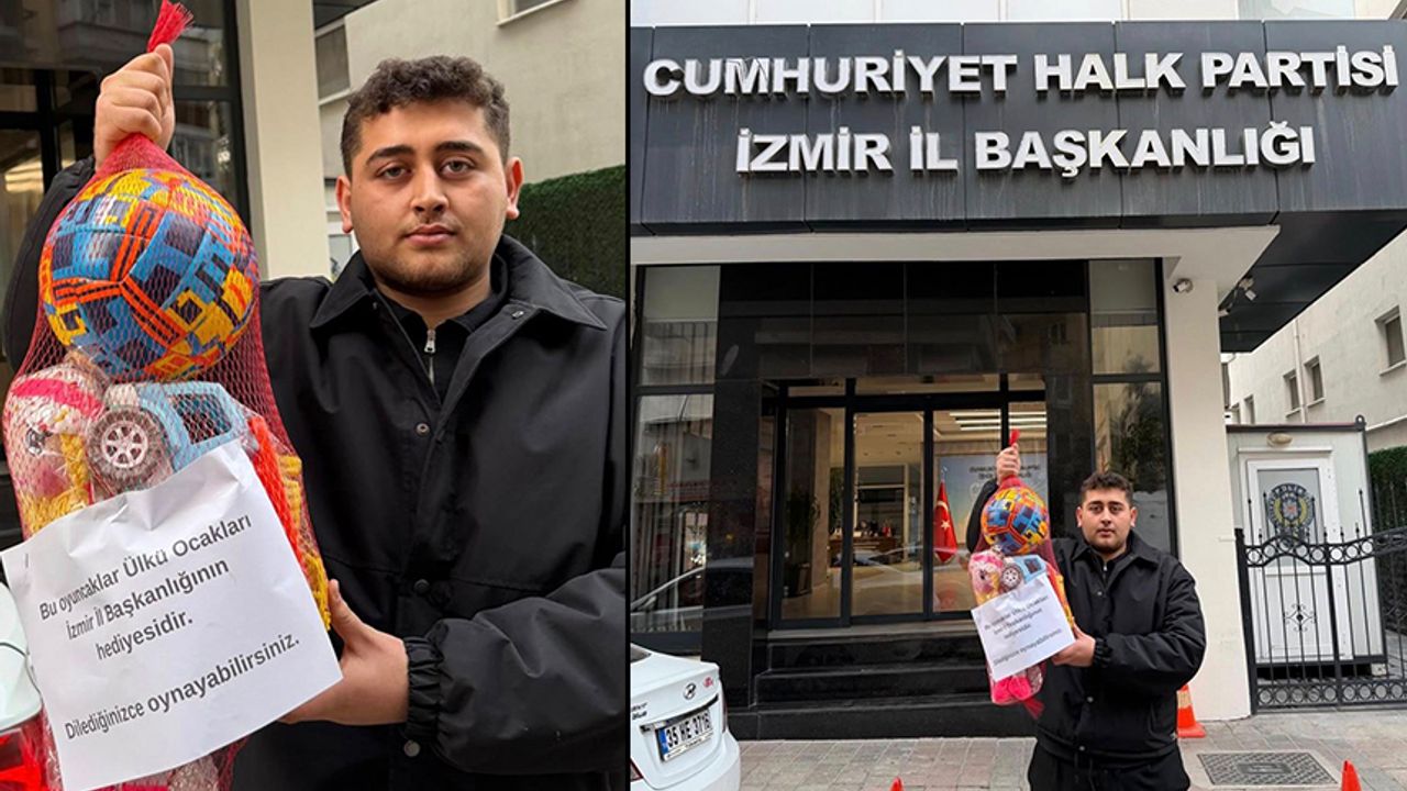 Açıklamanın ardından Ülkü Ocakları üyesi bir genç, yaşananlara tepki göstererek CHP İzmir İl Başkanlığı’na gelerek bir poşet oyuncak bıraktı.