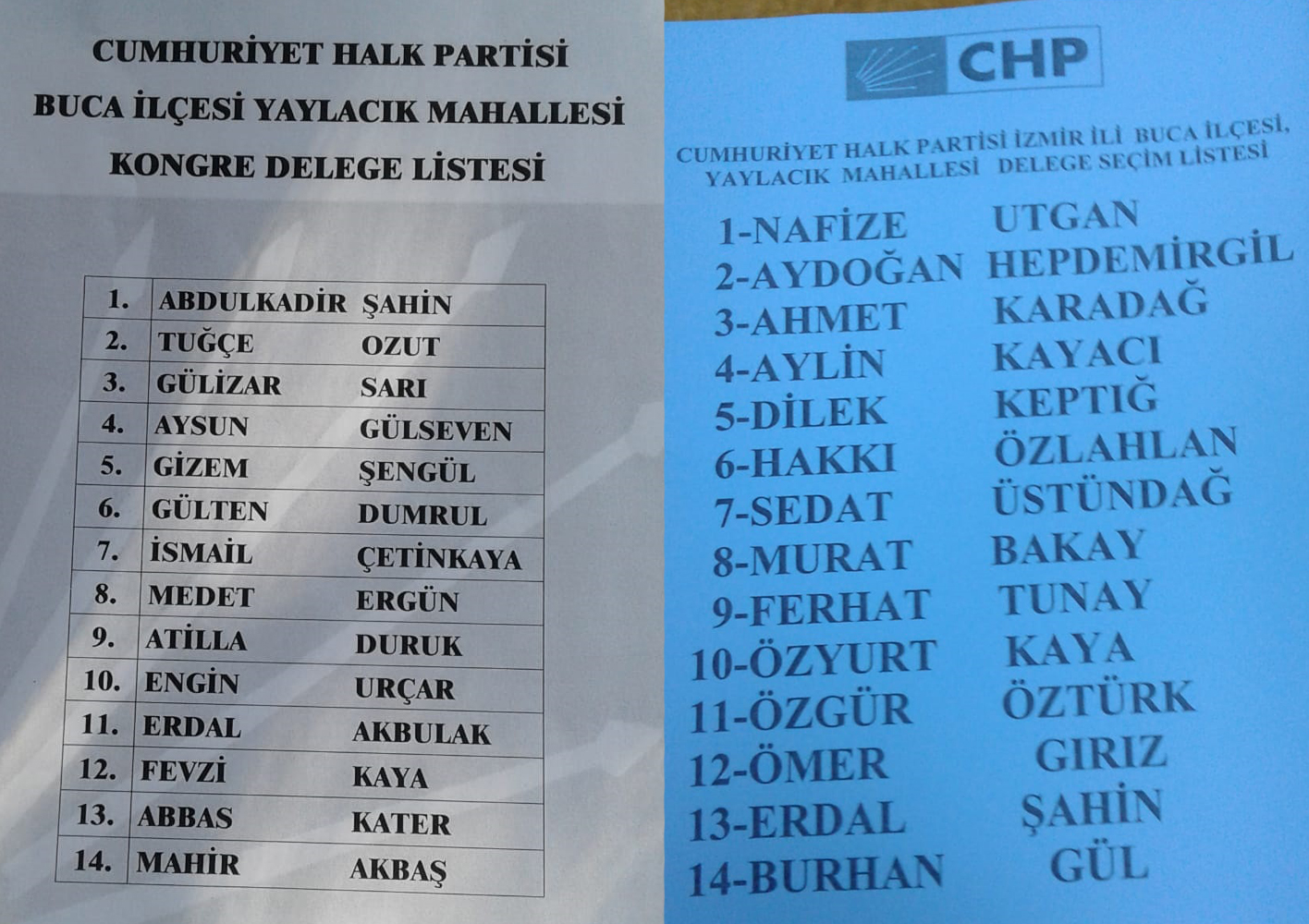 Yaylacık Mahallesi'nde de sandığa çift listeyle gidildi. Sandıkta mavi ve beyaz listeler yarıştı. Mavi listede 31 Mart yerel seçimlerinde Buca Belediye Başkanlığı için ismi MYK'dan çıkan ancak Parti Meclisi'nden onay alamayan Aydoğan Hepdemirgil yer aldı.