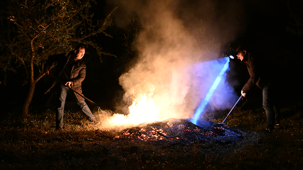 Çiftlikte görevli Ziraat Mühendisi Muharrem Çaka, “Sıcaklıkların iki gece boyunca eksi 3 dereceye düşmesi bekleniyor. Bu dumanlama sistemi ile 2 derece bahçemizi sıcak tutarak meyveye gelmekte olan bademlerimizi koruma altına alıyoruz” ifadelerini kullandı.