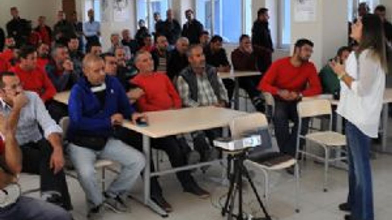 Şantiye binası konferans salonunda sunum yapan İş Güvenliği Uzmanı Özlem Aydoğan, işverenin çalışma alanında iş güvenliğini sağlamak için her türlü önlemi almak zorunda olduğu gibi, çalışanların da yasal hak ve hükümlülüklerden haberdar olması gerektiğinin önemine dikkat çekti. Bu aşamada mesleki eğitimin çok önemli olduğunu, işçinin işiyle ilgili yaşayacağı her türlü sıkıntı ve sorunun aşılmasında çalışanların da bazı genel yükümlülükleri yerine getirmesi gerektiğine değinen Aydoğan, 'Verilen eğitimlerin amacı çalışanları korumak ve işletmenin güvenliğini sağlamaktır. Bir işin yapılmasında mutlaka riskler vardır. Bu riskler karşısında nasıl bir tavır sergilenmelidir, işçinin olacak olaylara ilişkin genel ön yargılarının ve yanlışlarının giderilmesi bu bilgilendirme toplantılarımızın amacını oluşturmaktadır. İş yerlerinde meydana gelen kazalar dalgınlık, dikkatsizlik ve ihmal sonucunda meydana gelmektedir. Bu durumun önüne geçilmesinde yapılması gereken en önemli şeyeğitimdir' dedi.