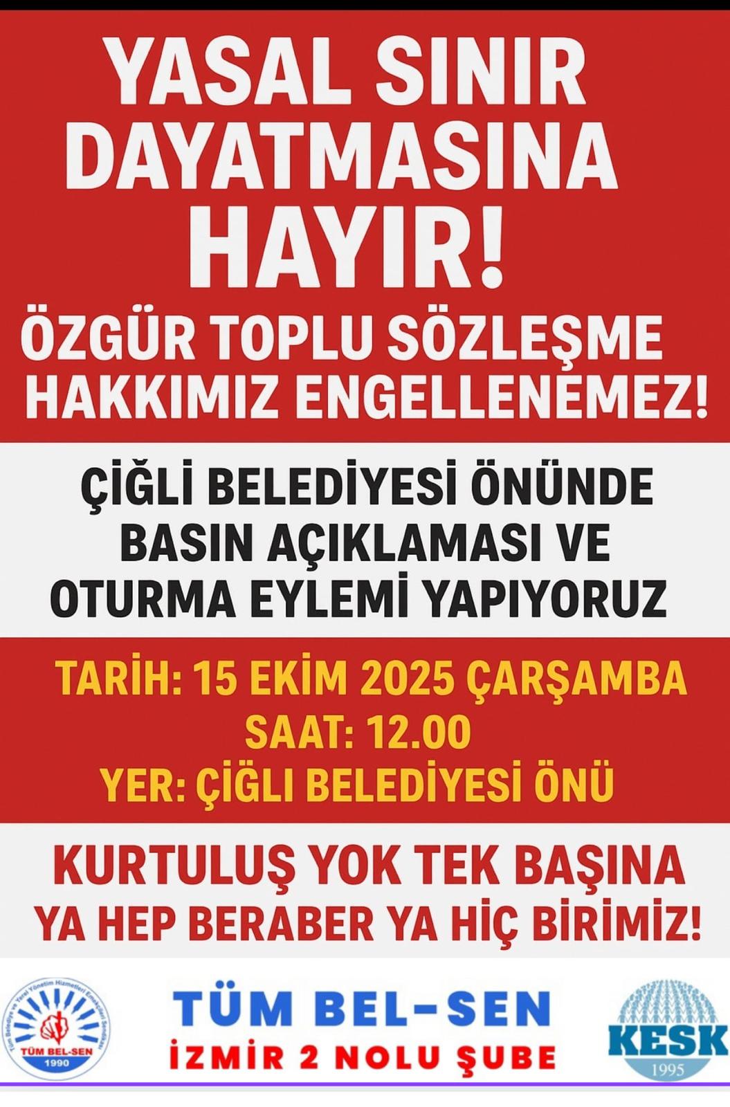 Bu kapsamda ödenmeyen TİS alacaklarımız için, TİS hakkımızın yasal sınıra çekilmemesi için 15 Ekim 2025 tarihinde saat 12.00'de Çiğli Belediyesi önünde basın açıklaması yaparak, demokratik meşru tepkimizi göstereceğiz. Bütün kamu emekçilerini, emekçi dostlarını Çiğli önünde yapacağımız basın açıklamasına çağırıyoruz.