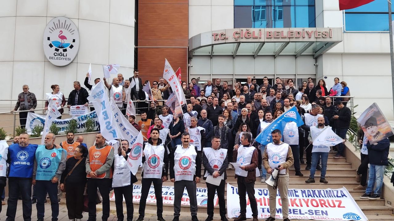 EGEDESONSÖZ- Çiğli Belediyesi'nde örgütlü memur sendikaları ödenmeyen sosyal denge tazminatlarından dolayı iş bırakma eylemi yaptı. Tüm Bel-Sen, Tüm Yerel-Sen ve Birlik Yerel-Sen üyesi memurlar bugün hizmet vermedi.