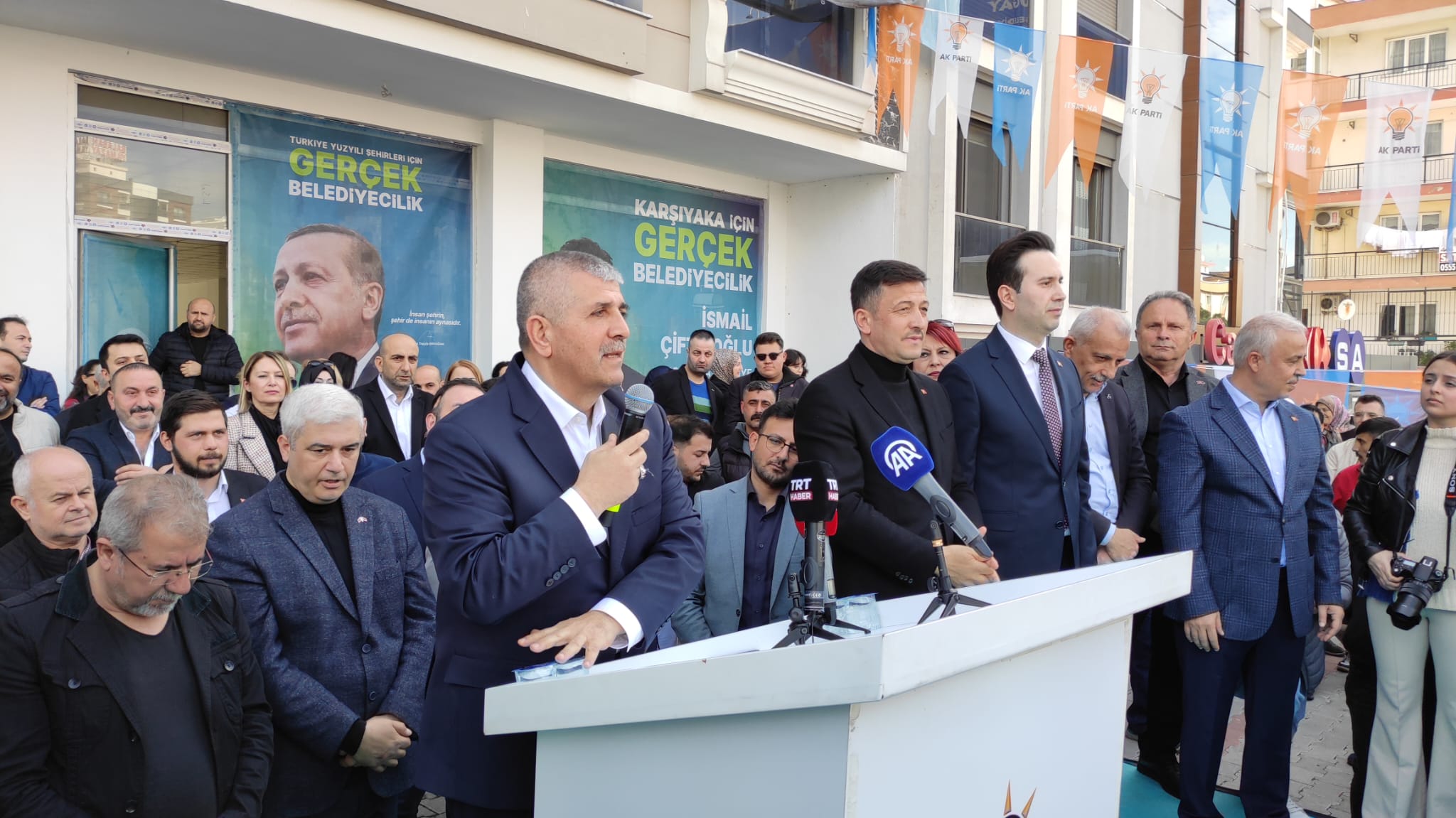1 Nisan'da tarih yazacaklarını belirten Cumhur İttifakı Karşıyaka Belediye Başkan Adayı İsmail Çiftçioğlu, 'Ben şahsım olarak dün de aranızdaydım. Bugün de yanınızdayım. Bugün olduğu gibi yarın da bu kentimizin kaderini sizlerle beraber paylaşacağım. Dolayısıyla bizler Karşıyaka ve bu önümüzdeki süreçte sevdamız Karşıyaka için el birlikle çalışacağız. Büyük bir onur ve gurur duyuyorum. Çünkü kentimizi bilen, sokaklarımızı, mahallelerimizi bilen 13 yıldan bu yana İzmir'in her noktasında kentte emeği olan bir büyükşehir belediye başkan adayımız var. Hamza Dağ Başkanım var. Sadece bu kentte değil insan olarak da hepimizin yanında olan, hepinizin acı, zor ve mutlu günlerinde bizlere sahip çıkan bir Hamza Dağ Başkanı var. Hamza Dağ Başkanımızla, yol yürümek, bu mücadelede Karşıyaka için, İzmir için bu sevdaya baş koymak bizler için bi şeref madalyasıdır. Inanıyorum ki 1 Nisan'da İzmir'de Hamza Dağ başkanımla, Karşıyaka'da bizler, yeni bir tarih hikayesini yazacağız. Bütün bu çalışmalarımızı, projelerimizi, Cumhur İttifakımızın, teşkilatlarıyla, bizlerle, sizlerle bu önümüzdeki süreç boyunca omuz omuza çalışacağız. Ve bu sefer sadece kendiniz değil, mahallemize gittiğinizde, iş yerimize gittiğimizde komşuluklara gittiğimizde hep beraber bir Hamza Dağ gibi, bir İsmail Çiftçioğlu gibi çalışacağız. Bu kutlu yolculukta yürümeye var mısınız?' ifadelerini kullandı.