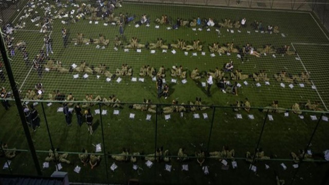 Yoğun güvenlik önlemi altında getirilen askerlerin, yerleşke içindeki halı sahada ikişerli olarak sırt sırta, elleri arkalarından kelepçeli oturtulduğu görüldü.