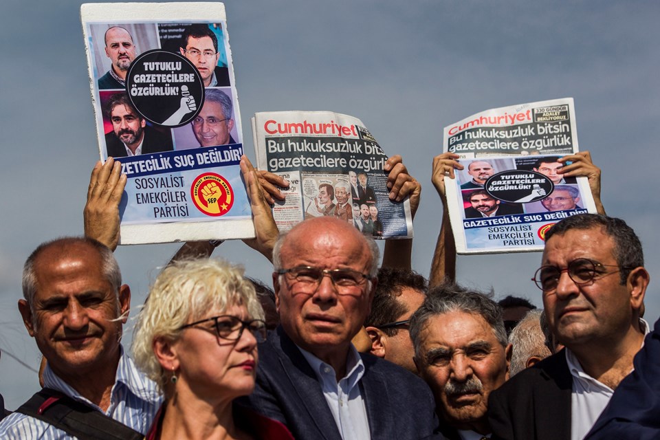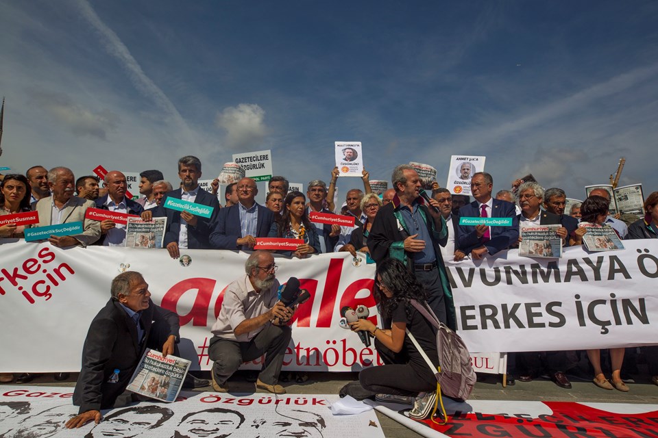 CHP Grup Başkanvekili Engin Altay, CHP milletvekilleri Sezgin Tanrıkulu, Barış Yarkadaş, Mahmut Tanal ve Gamze Akkuş İlgezdi, HDP milletvekili Garo Paylan, avukat ve gazetecilerin de yer aldığı gruptakiler, 'Savunmaya özgürlük, herkes için adalet' ve 'Gazetecilere özgürlük' pankartları açtı.
