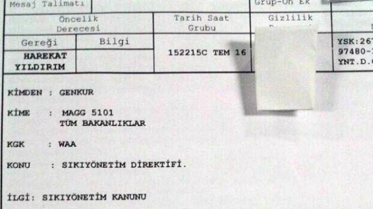 İl idarelerinin Sıkıyönetim Komutanlıklarına devredileceğinin söylendiği talimat ana hatlarıyla şöyle: 'Tüm polis teşkilatı Sıkıyönetim komutanları emrine alınmıştır. Vazifenin yerine getirilmesinde kusurlu davrananlar hakkında gereken adli ve idari işlemler sıkıyönetim komutanlıklarınca yapılacaktır. Asayiş ve emniyet temini maksadıyla sıkıyönetim komutanları, il-ilçe belediyeleri, emniyet müdürlükleri yakın işbirliği ve koordinasyon içinde çalışacaktır. Bu kapsamda vatandaşların da desteğinin sağlanması için gerekli tedbirler alınacaktır. Yurtta Sulh Konseyi tarafından yürürlüğe konacak tüm talimat ve bildiriler Genelkurmay Başkanlığı resmi internet sitesinden duyurularak resmi olarak tebliğ edilecektir.' Darbe girişimi ise Yıldırım Harekat Planı kapsamında icra edildiği anlaşılıyor. Eğer darbe başarılı olsaydı, Türkiye'de milli iradenin yanında olan binlerce isim askeri mahkemelerde yargılanacak ve hapsedilecekti.
