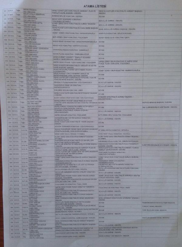 Listede, bazı askerlerin rütbeleri yeterli olmamasına rağmen önemli görevlere atandıkları ortaya çıktı. Birçok albayın, Amiral ve General makamlarına atandıkları görüldü. Bu arada, bazı askerlerin bulundukları görevlerine devam etmelerinin istendiği görüldü. Bazı askerlerin ise görevden el çektirilip komutanlık makamlarına atanacakları da yine belgelerde yer aldı. (dha)